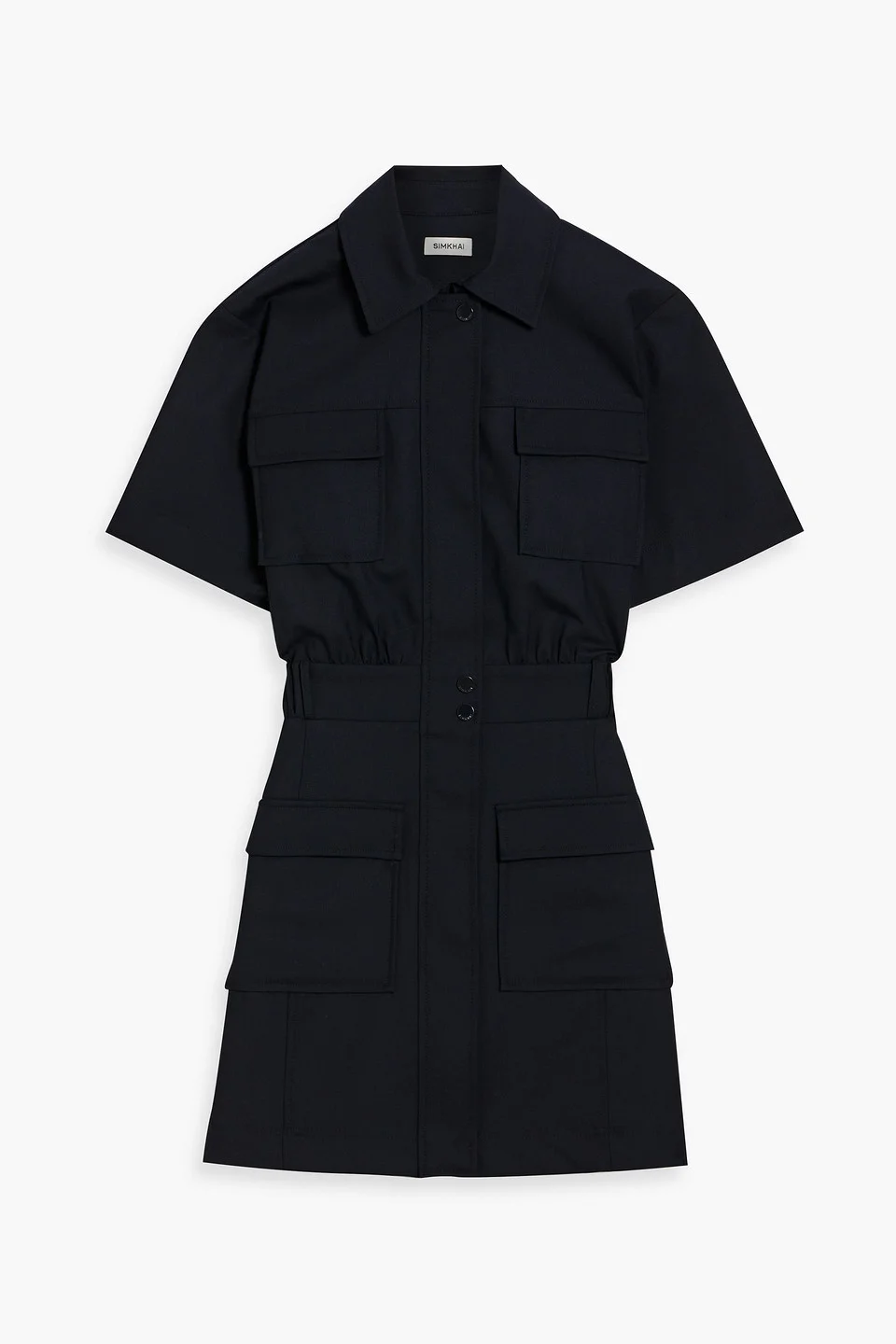 Shirt dress twill wool-blend partially elasticated waist breast pockets front flap pockets snap and concealed zip fastenings through front mid-weight, non-stretchy fabric dry clean imported 51% Wool 43% Polyester 6% Viscose Product Code 46376663162910635