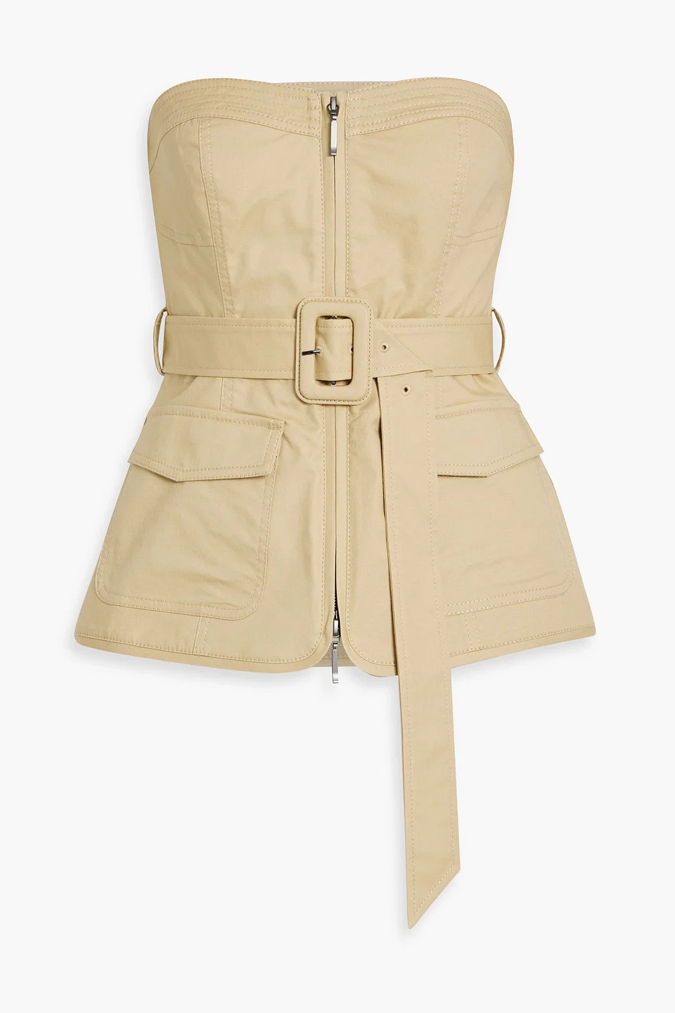 Strapless top cotton-blend quilted trims detachable belt two front flap pockets concealed two-way zip fastening through front mid-weight, non-stretchy fabric dry clean imported 98% Cotton 2% Spandex Product Code 46376663162888637