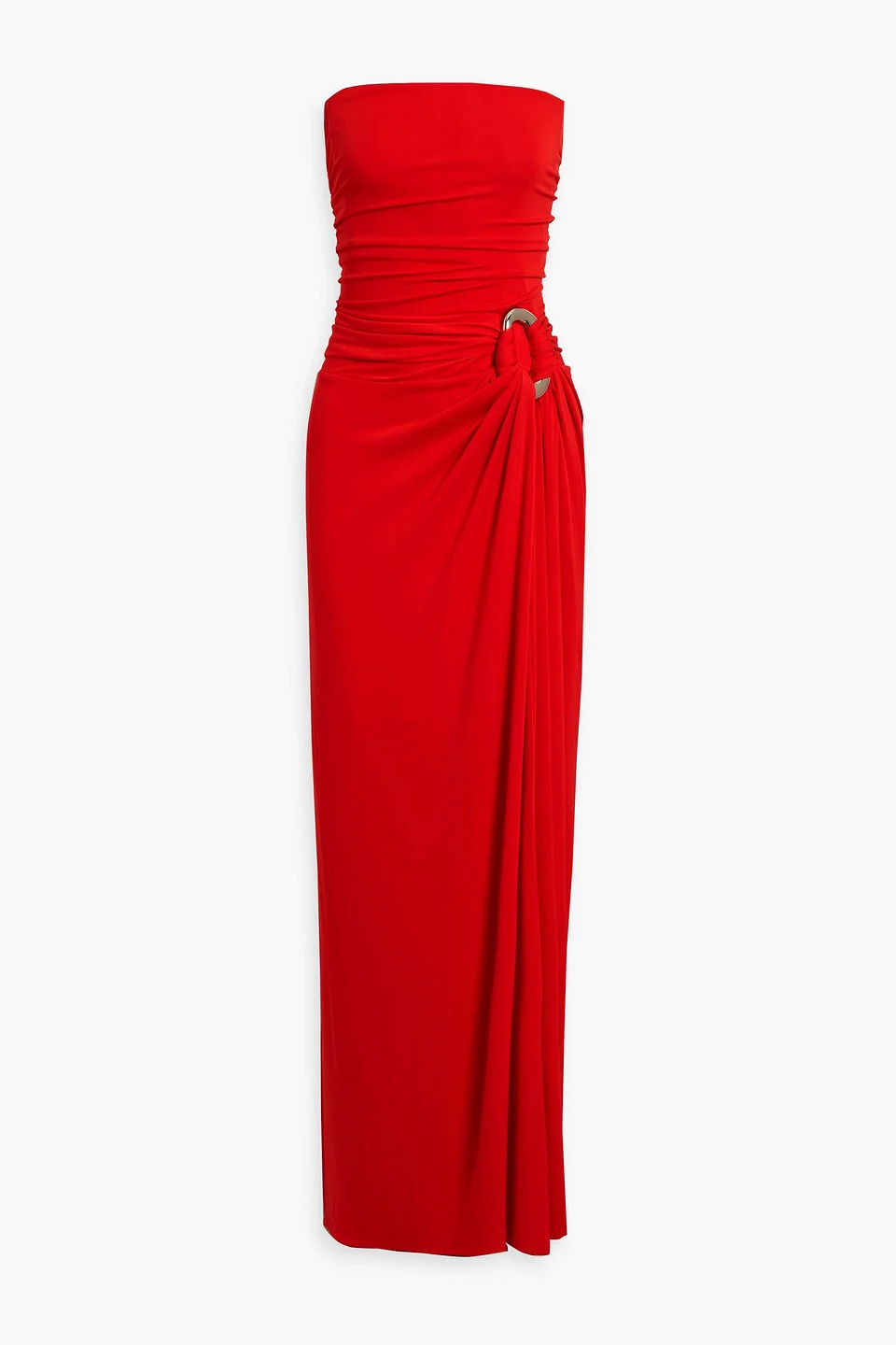 Gown jersey ring embellishment draped concealed hook and zip fastening at back internal bustier fully lined mid-weight, stretchy fabric dry clean imported Ring the alarm – Simkhai’s 'Emma' gown is red-hot. It’s made from jersey with a touch of stretch and has a sculptural ring-embellishment that’s oh-so-modern. Elegant draping creates an ultra-flattering silhouette that will have everyone wide-eyed. 96% Rayon 4% Spandex Product Code 46376663163008727