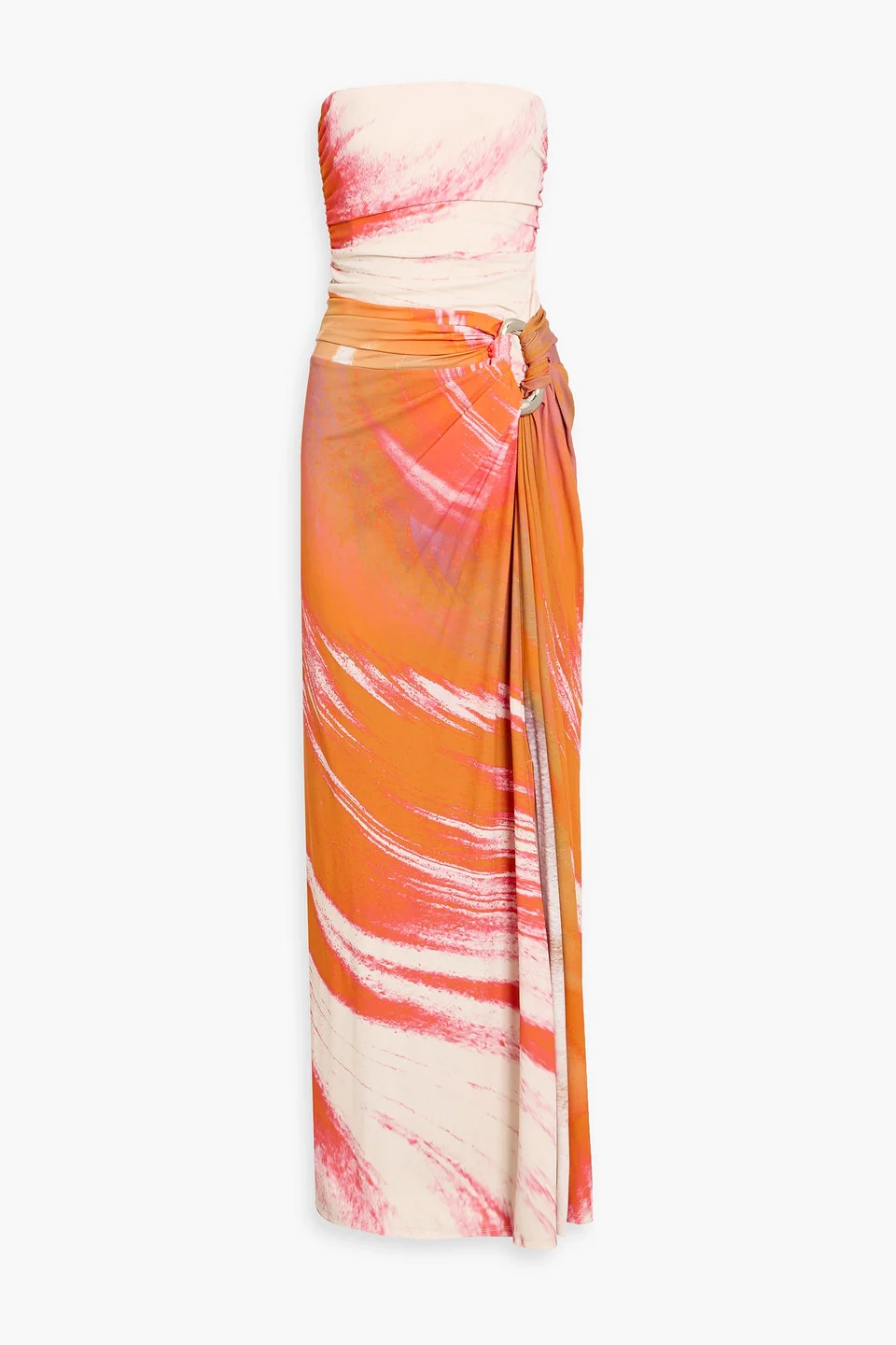 Strapless dress printed stretch-jersey ring embellishment ruched front slit concealed hook and zip fastening at back built-in shelf bra mid-weight, stretchy fabric dry clean imported 96% Rayon 4% Spandex Product Code 46376663163100132