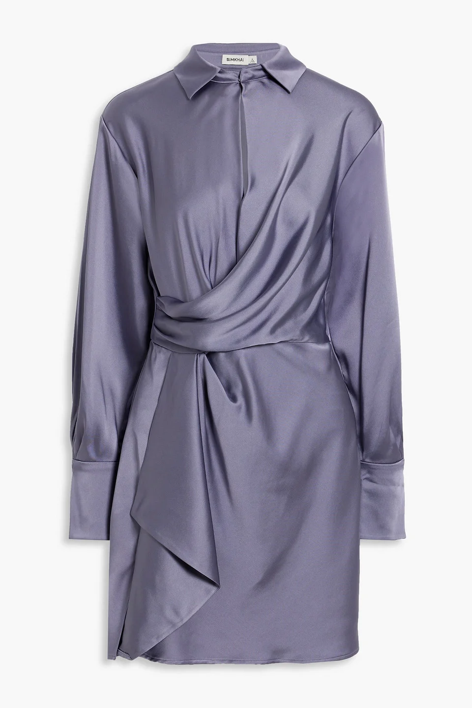 Dress satin wrap-effect draped panel buttoned cuffs hook fastening at front concealed zip fastening along side mid-weight, non-stretchy fabric dry clean imported 89% Acetate 11% Polyester Product Code 1647597359978826