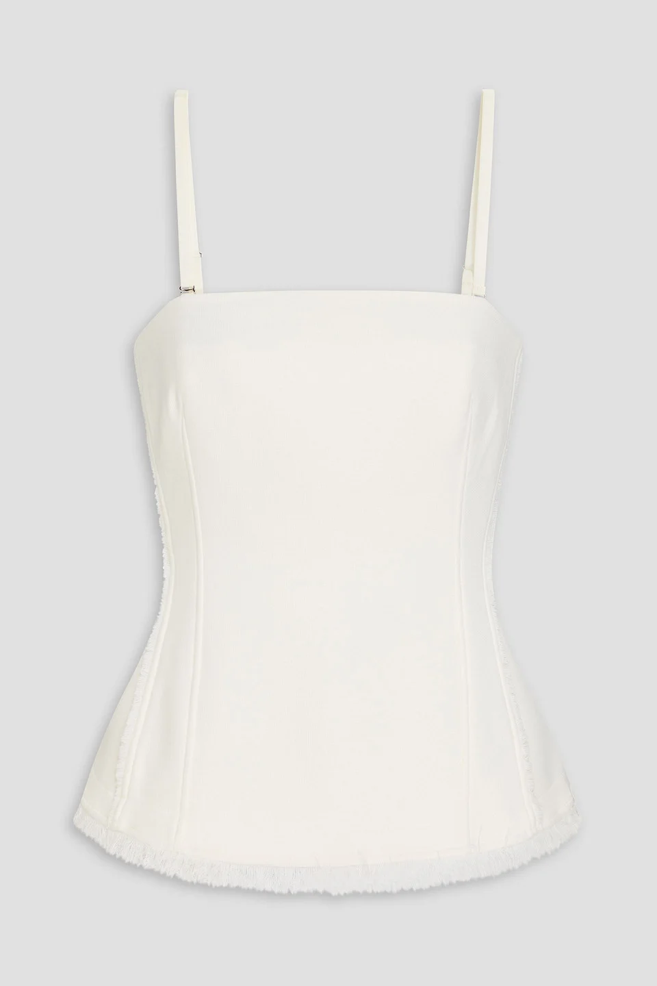 Top knitted frayed trims detachable shoulder straps concealed hook and zip fastening at back internal bustier mid-weight knit machine wash imported 62% Polyester 33% Rayon 5% Spandex Product Code 46376663162998258