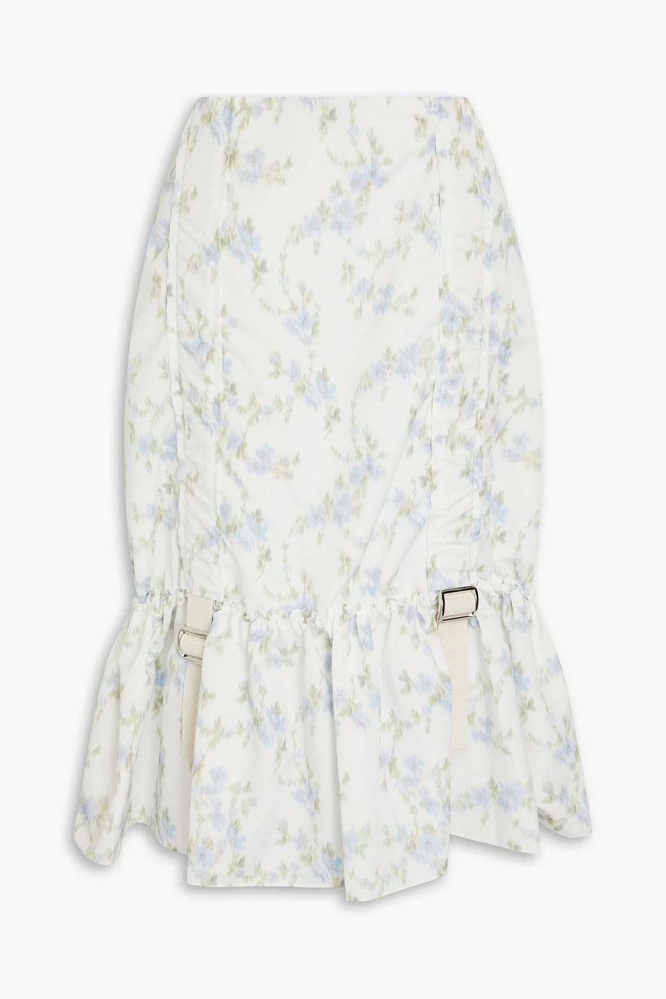 Buckle-detailed ruffled floral-print taffeta midi skirt