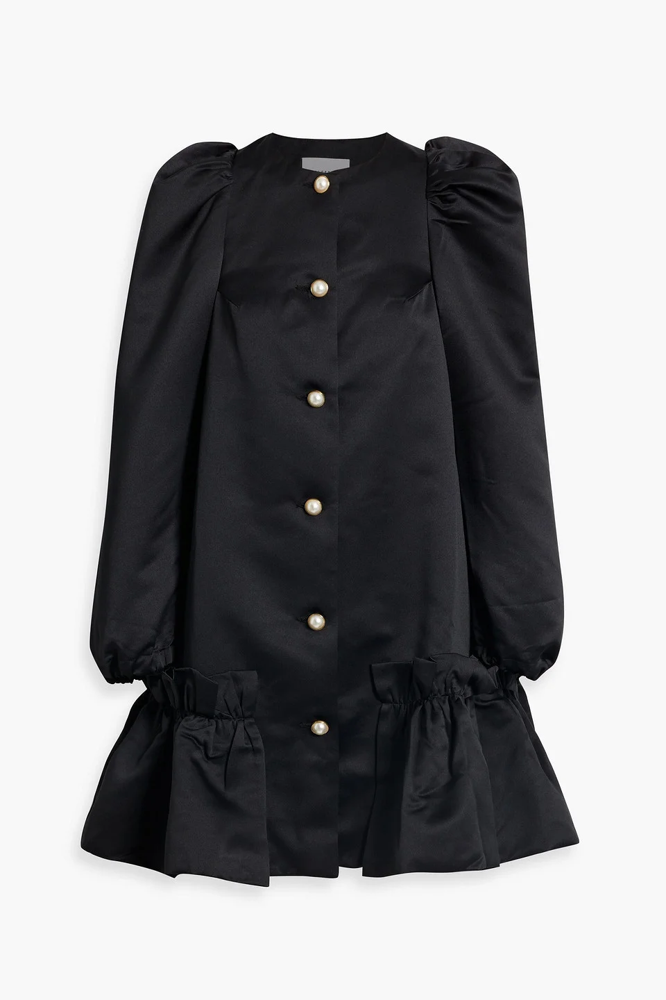 Dress satin puffed sleeves ruffled hem button fastenings through front fully lined non-stretchy fabric mid-weight fabric dry clean imported 100% Polyester Product Code 1647597286163045