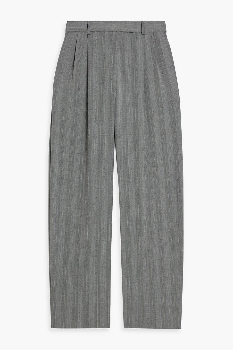 Wide-leg pants pinstriped twill pleated front slant pockets back welt pockets belt loops high-rise cut concealed hook, button and zip fastening at front mid-weight, non-stretchy fabric dry clean imported 48% Polyester 48% Virgin Wool 4% Elastane Product Code 46376663163071806
