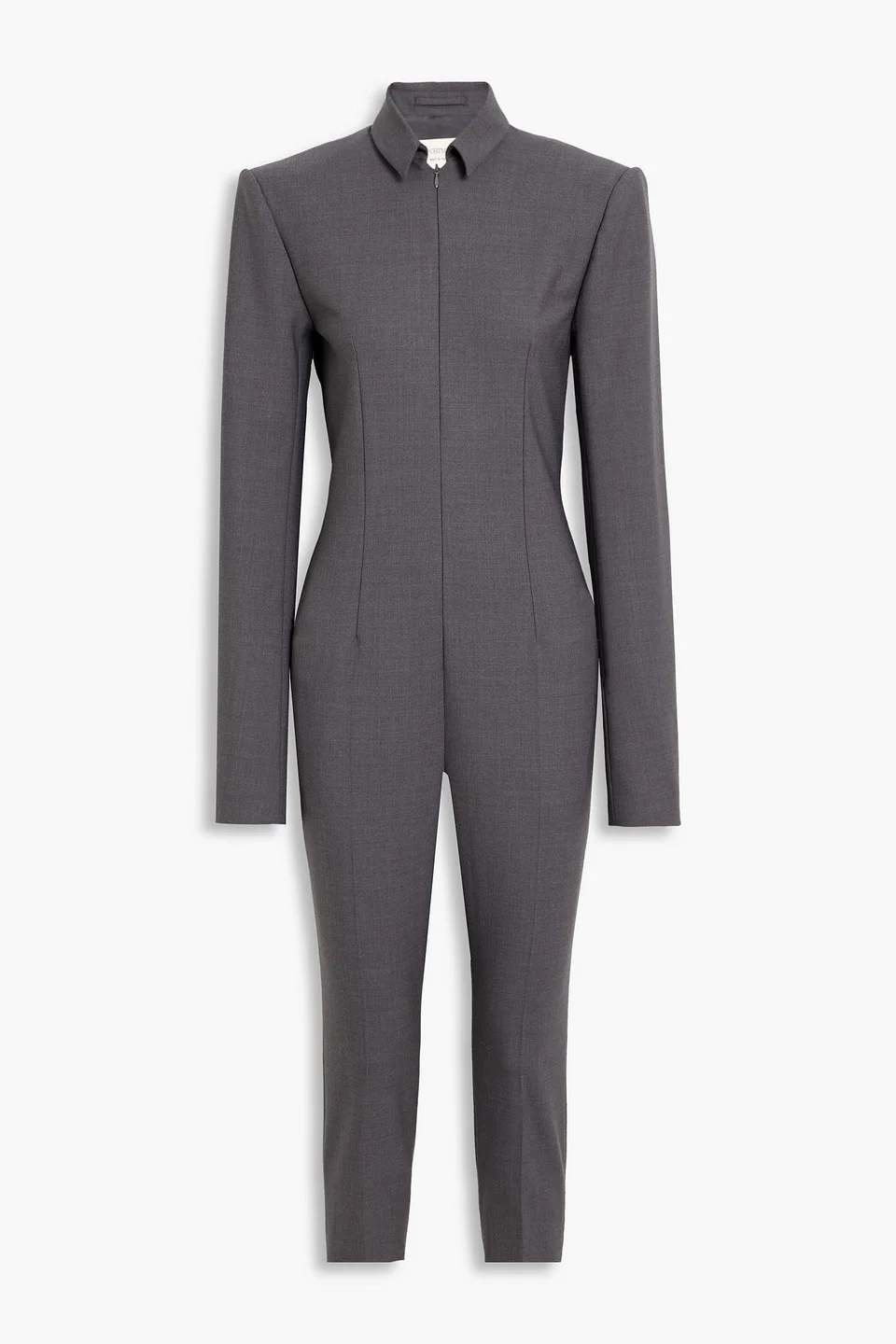 Jumpsuit woven cropped exaggerated shoulder pads buttoned cuffs front slant pockets concealed zip fastening through front mid-weight, slightly stretchy fabric dry clean made in italy 48% Polyester 48% Virgin Wool 4% Elastane Product Code 46376663163044180