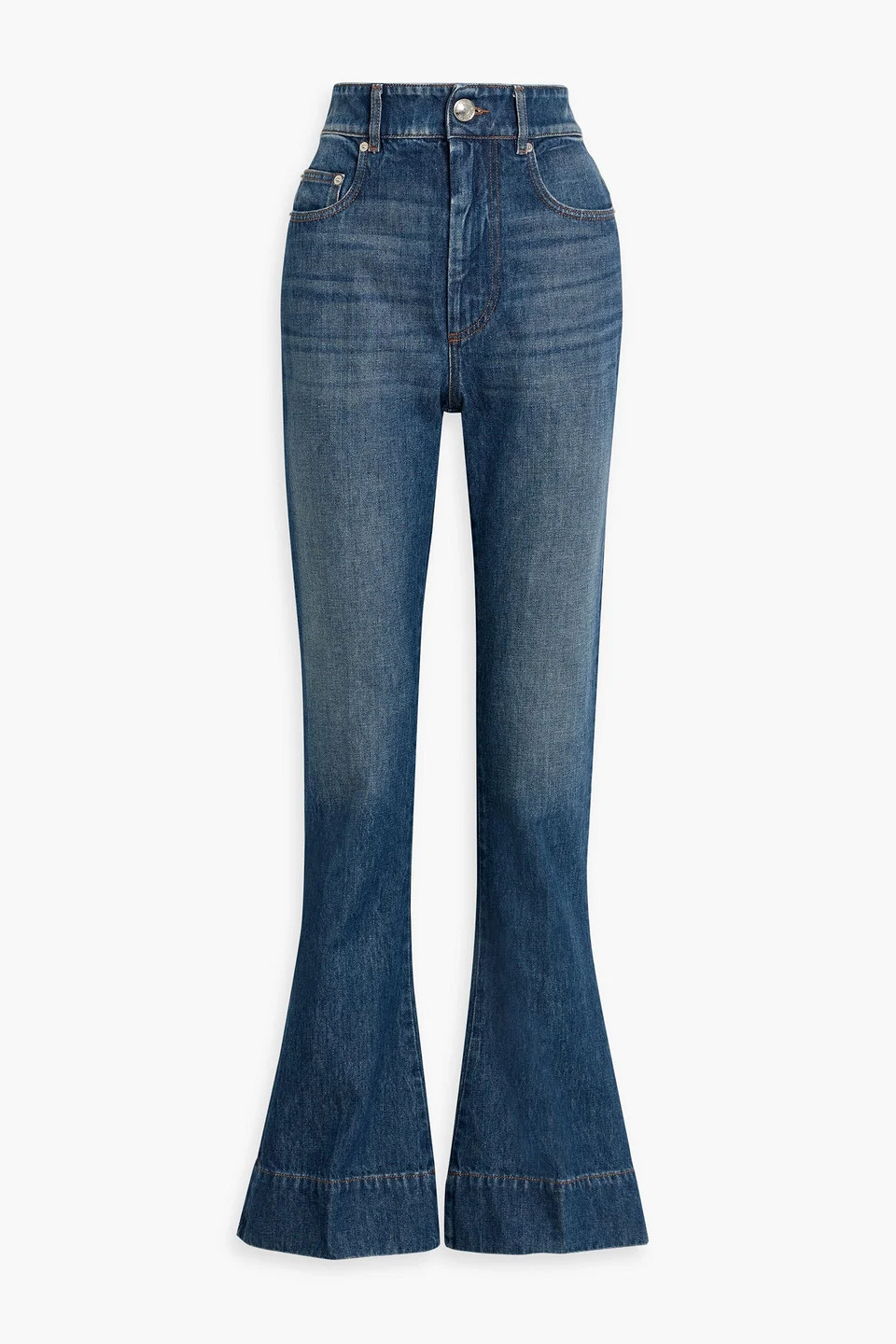 Flared jeans faded denim belt loops high-rise cut five pockets button and concealed zip fastening at front mid-weight, non-stretchy fabric machine wash imported 100% Cotton Product Code 46376663163071968
