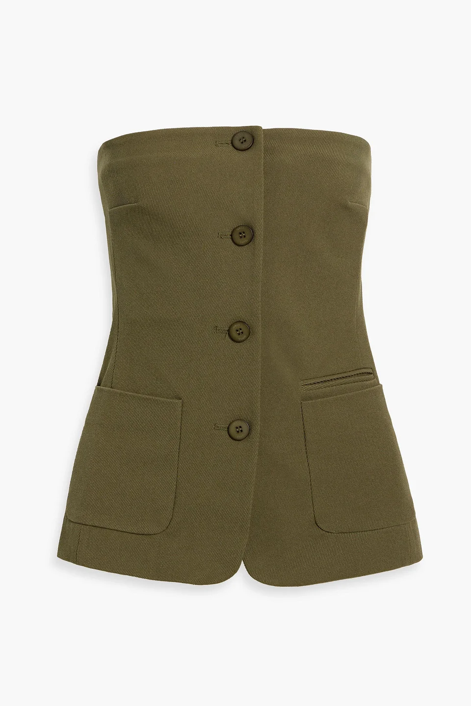 Strapless top twill front welt pocket front patch pockets button fastenings through front mid-weight, non-stretchy fabric dry clean imported 68% Polyester 29% Rayon 3% Elastane Product Code 46376663162942048