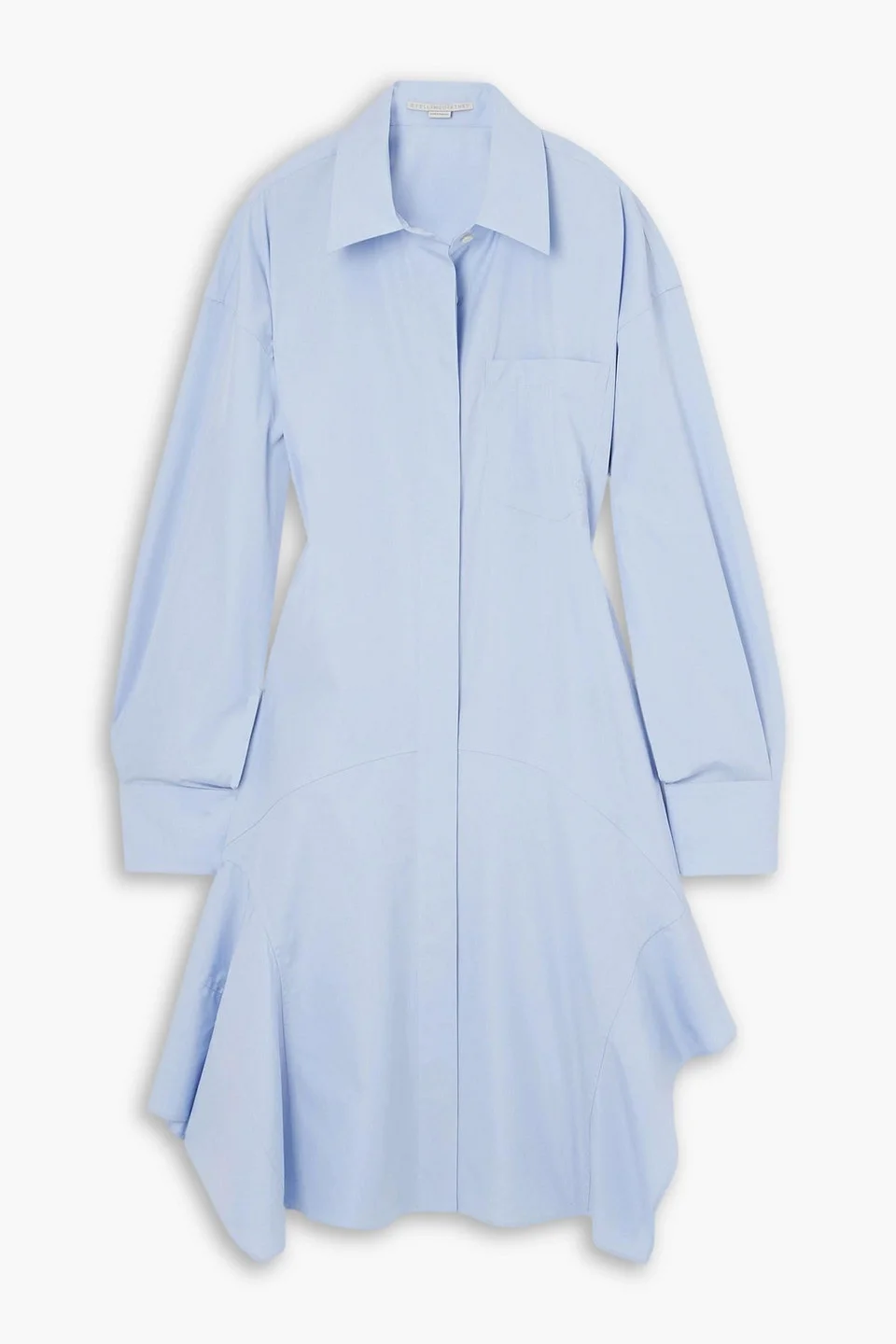 Shirt dress cotton-poplin buttoned cuffs breast pocket asymmetric hem partially concealed button fastenings through front mid-weight, non-stretchy fabric dry clean imported Stella McCartney's dress is modeled on classic tailoring. Cut from cotton-poplin in a timeless sky-blue, it has button-fastening cuffs and falls to an asymmetric hem. The length is perfect for pairing with tall boots. 100% Cotton Product Code 1647597325334266