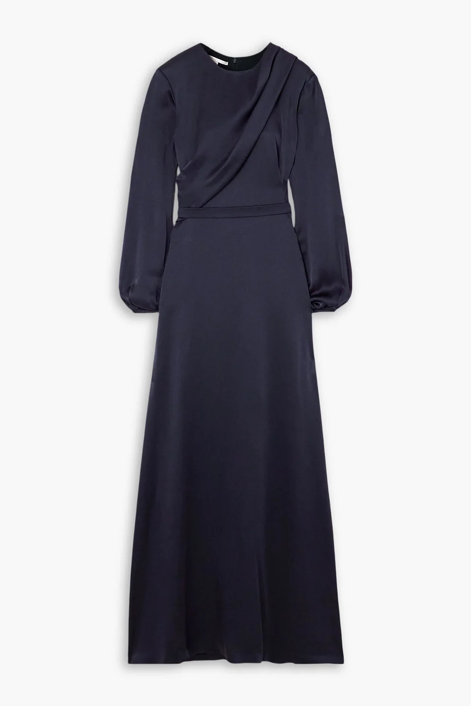 Gown satin shoulder pads draped detachable belt gathered sleeves buttoned cuffs concealed hook and zip fastening at back partially lined mid-weight, non-stretchy fabric dry clean made in italy 64% Acetate 36% Viscose Product Code 1647597324573966