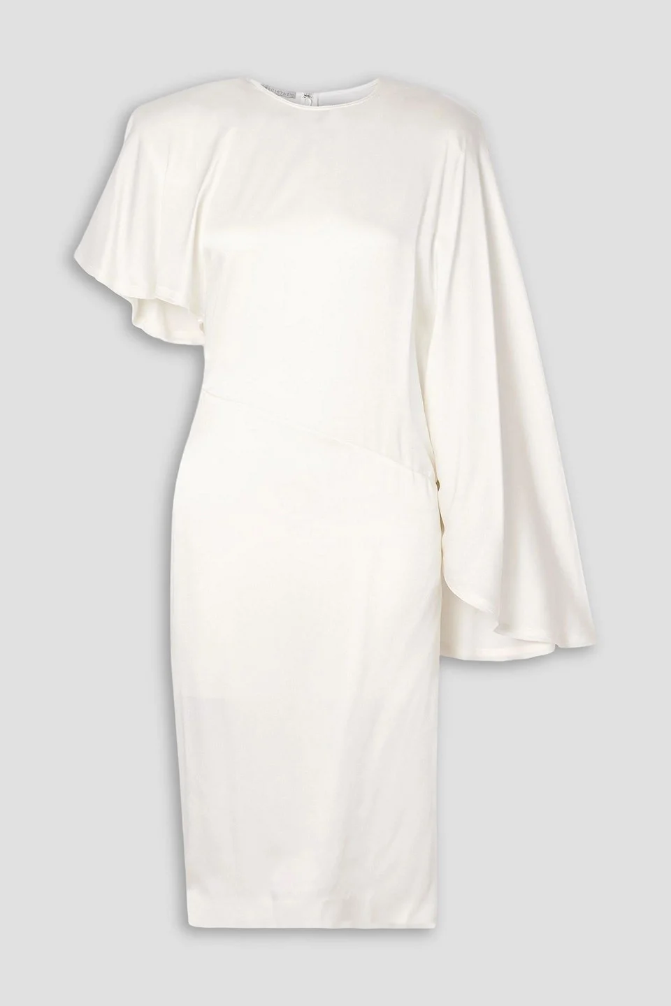 Dress satin frayed trims draped asymmetric shoulder pads back slit concealed hook and zip fastening at back mid-weight, non-stretchy fabric dry clean made in italy 58% Viscose 42% Acetate Product Code 1647597342815374