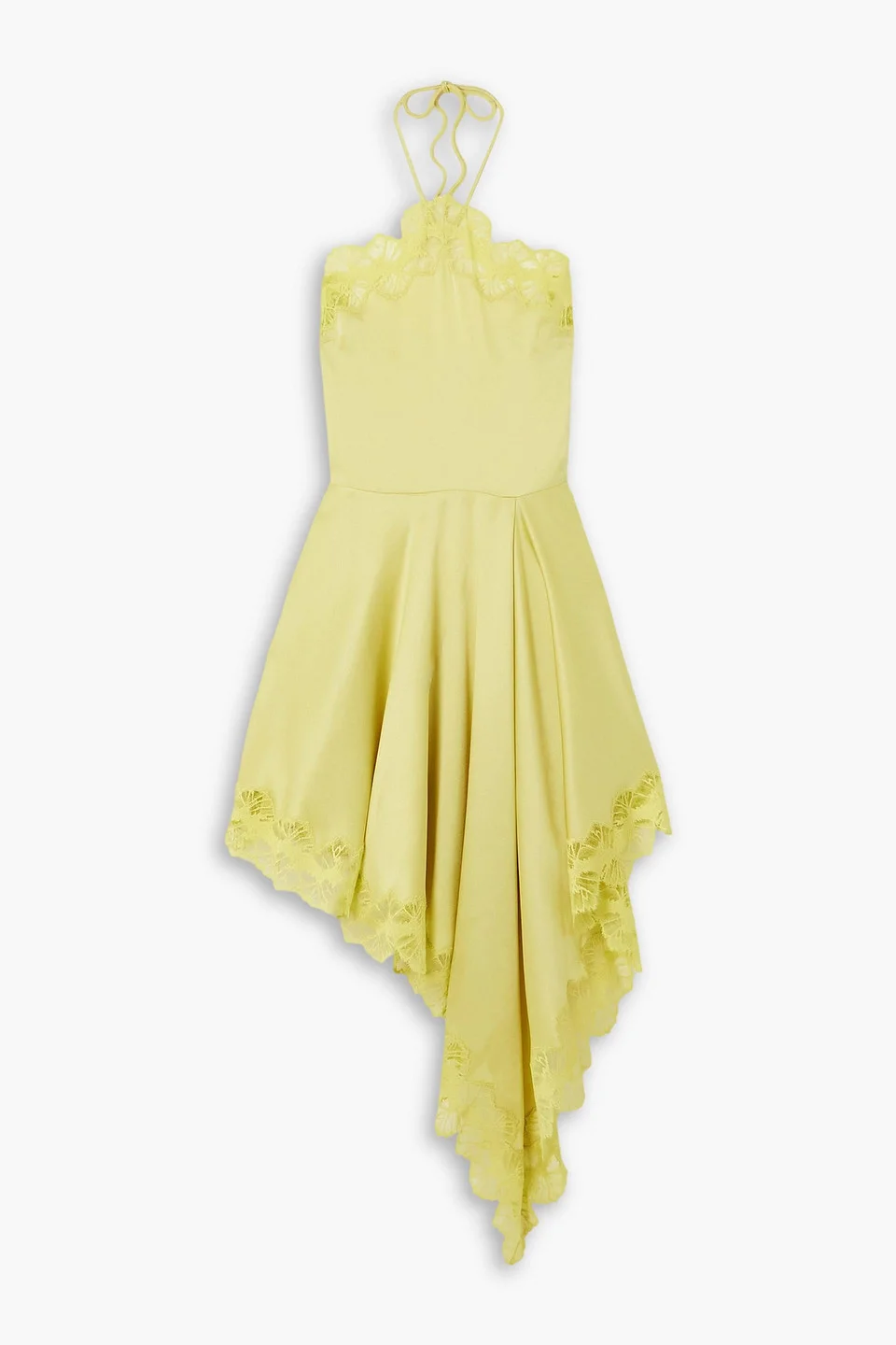 Asymmetric halterneck lace-trimmed satin mini dress
