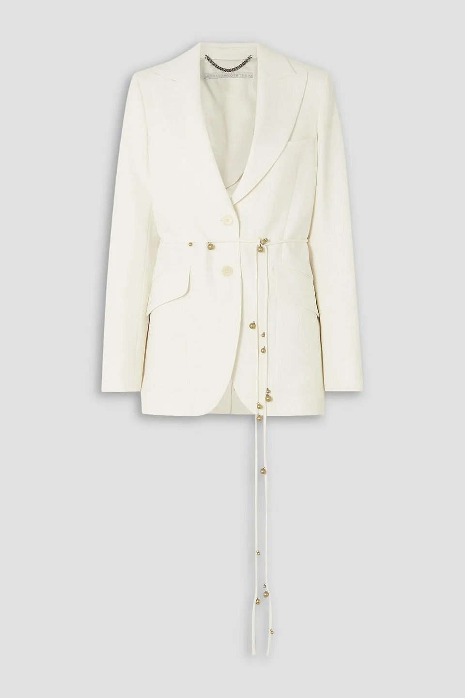 Blazer twill beads detachable waist tie buttoned cuffs breast pocket two front flap pockets button fastenings through front partially lined back vent slightly stretchy fabric mid-weight fabric dry clean imported No wardrobe is complete without sharp tailoring, add Stella McCartney's blazer to your own. Cut from cream twill, it has padded shoulders and a long beaded belt to lend a bohemian feel. 53% Polyester 43% Wool 4% Elastane Product Code 43769801095544579