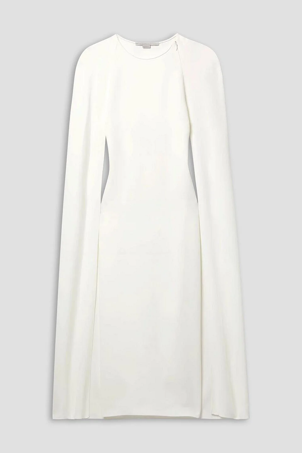 Dress crepe cape overlay two side slit pockets back slit concealed hook and zip fastening at front mid-weight, slightly stretchy fabric dry clean imported Stella McCartney's dress is a sophisticated choice for special occasions, especially upcoming bridal events. It's made from white crepe and has a cape-effect overlay that creates beautiful movement with each step you take. Keep your jewelry minimal, think gold hoops and a simple necklace. 51% Viscose 47% Acetate 2% Elastane Product Code 1647597310899982