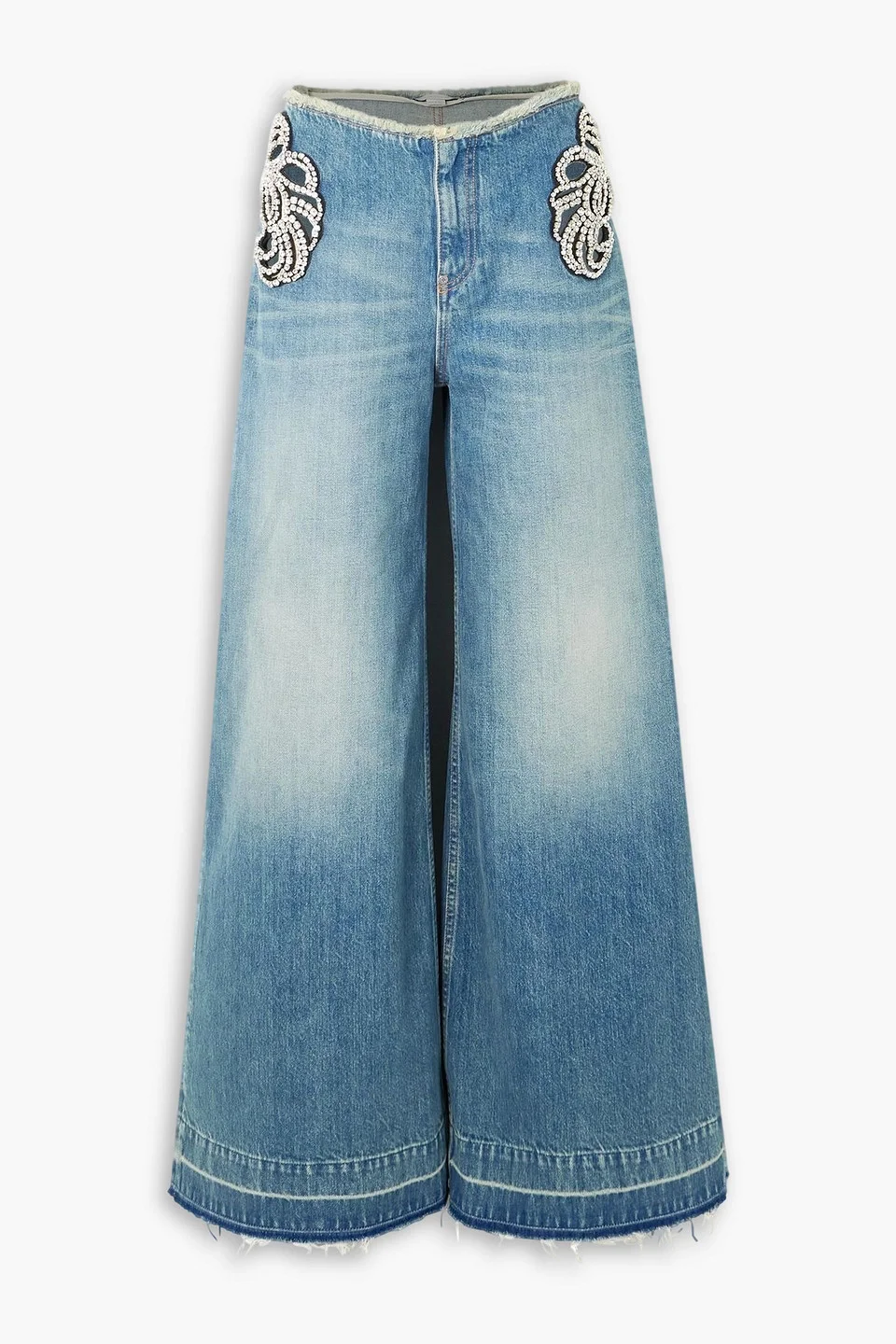 Wide-leg jeans denim crystals cutout frayed trims mid-rise cut back patch pockets concealed zip fastening along front mid-weight, non-stretchy fabric dry clean made in italy 100% Cotton Product Code 1647597337089787