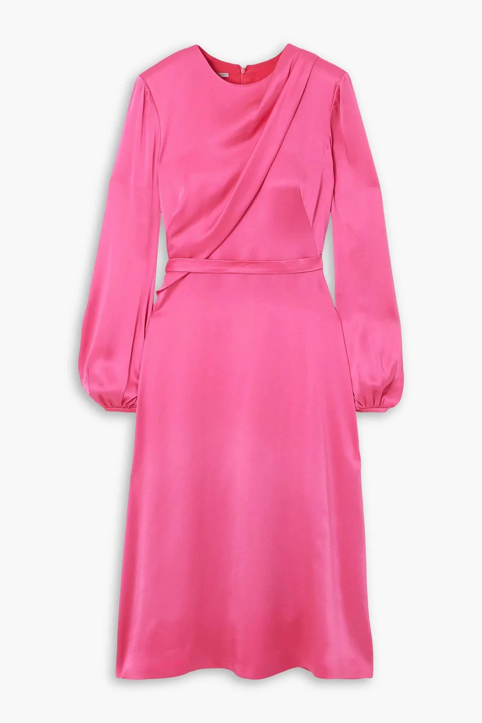 Dress duchesse-satin draped shoulder pads detachable belt buttoned cuffs concealed hook and zip fastening at back mid-weight, non-stretchy fabric dry clean made in italy You’ll feel so pretty in pink wearing Stella McCartney’s dress. It’s cut from bubblegum-hued duchesse-satin with draping at the bodice and billowy sleeves. Complete your look with sparkling jewelry. 64% Acetate 36% Viscose Product Code 46376663162956430