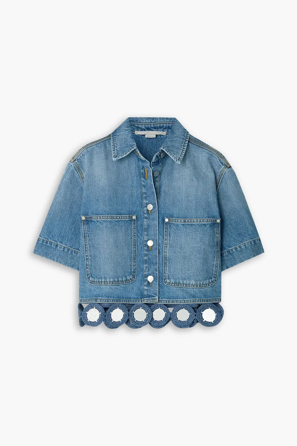 Shirt denim mirror embellishment crocheted lace trims front patch pockets button fastenings through front dry clean mid-weight, non-stretchy fabric imported 100% Cotton Product Code 1647597336551492