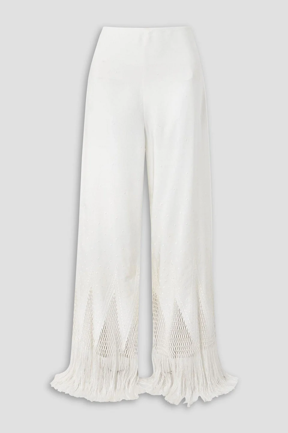 Fringed macramé-trimmed embroidered satin wide-leg pants