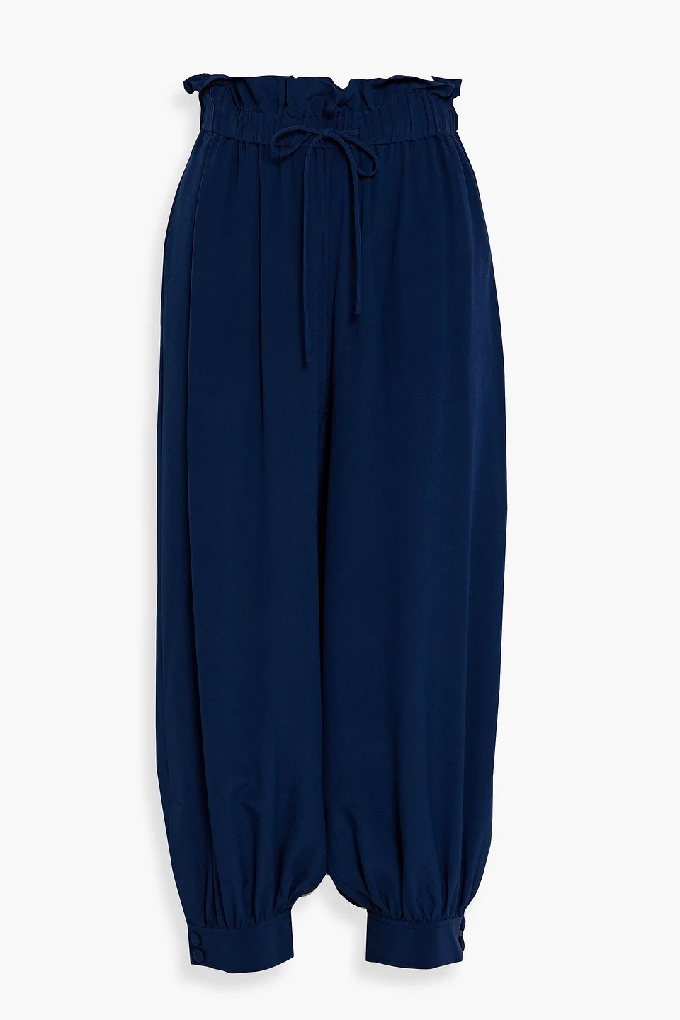 Tapered pants silk-crepe ruffled trims gathered elasticated drawstring waist high-rise cut snap-fastening hemline pull on non-stretchy fabric mid-weight fabric dry clean imported 100% Silk Product Code 1647597284974144
