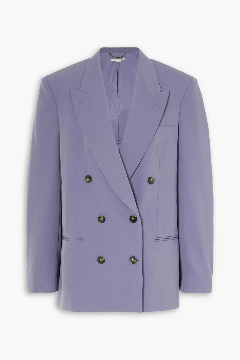 Blazer twill wool-blend shoulder pads buttoned cuffs breast pocket two front welt pockets button fastenings through double-breasted front fully lined dual back vents mid-weight, slightly stretchy fabric dry clean imported Sure to stand out amongst a sea of gray and navy, Stella McCartney's lilac wool-blend twill blazer nods to masculine tailoring with its structured lines and oversized fit. Wear yours with a tonal midi skirt or jeans. 97% Wool 3% Elastane Product Code 1647597310917563