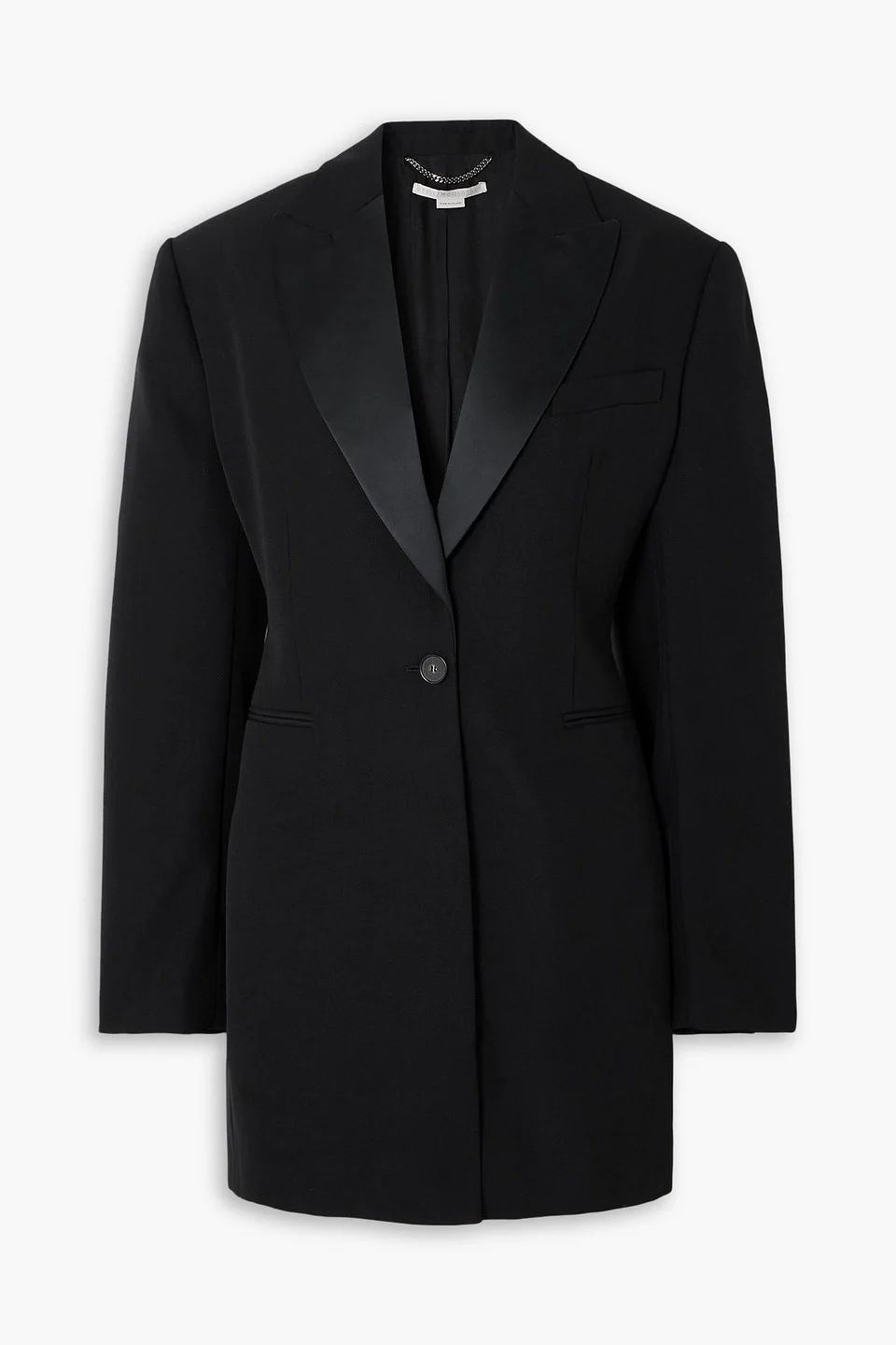 Dress grain de poudre wool satin trims buttoned cuffs front welt pockets button fastening at front fully lined mid-weight, non-stretchy fabric dry clean imported Stella McCartney does tailoring so beautifully – this mini dress is cut from grain de poudre wool with a nipped-in waist and dropped shoulders. The satin lapels add a formal flair and nod to the tuxedos it's modeled on. Add luxe accessories to complete your look. 100% Wool Product Code 1647597325334330