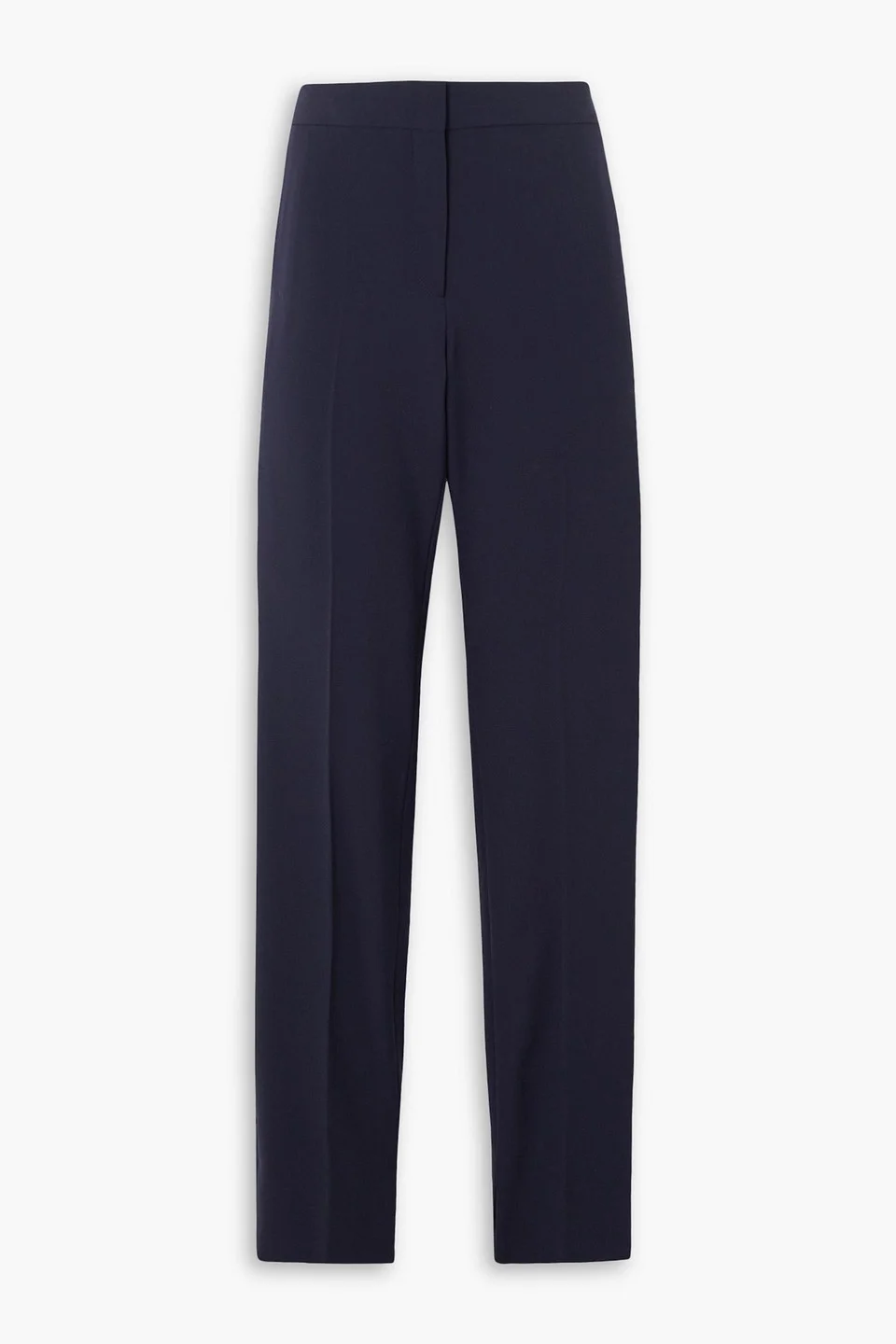 Straight-leg pants gabardine pressed creases two side slant pockets high-rise cut slit cuffs concealed hook, button and zip fastening at front mid-weight, stretchy fabric dry clean imported Stella McCartney's tailored pants are so versatile. Made from navy stretch-gabardine with plenty of wool in the blend, they're cut for a high-rise fit and have pressed creases through the straight legs. Switch between wearing yours with pumps and sneakers, depending on the occasion. 55% Polyester 41% Wool 4% Elastane Product Code 1647597289436766