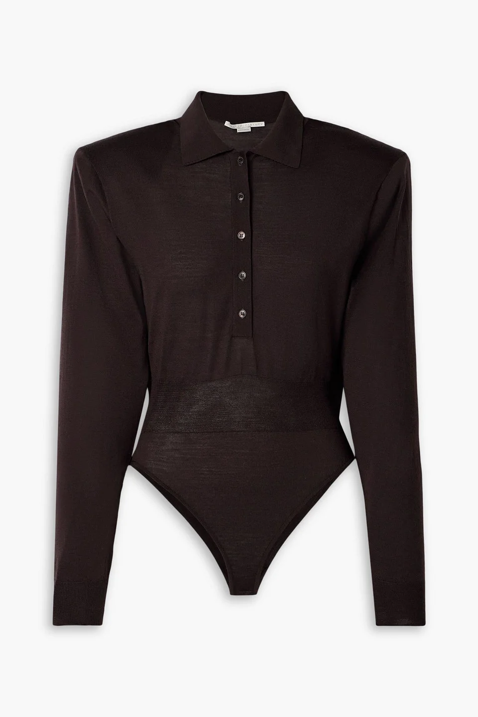 Bodysuit wool ribbed trims shoulder pads button fastenings along front snap fastenings at base mid-weight knit hand wash or dry clean imported 100% Virgin Wool Product Code 1647597342815694