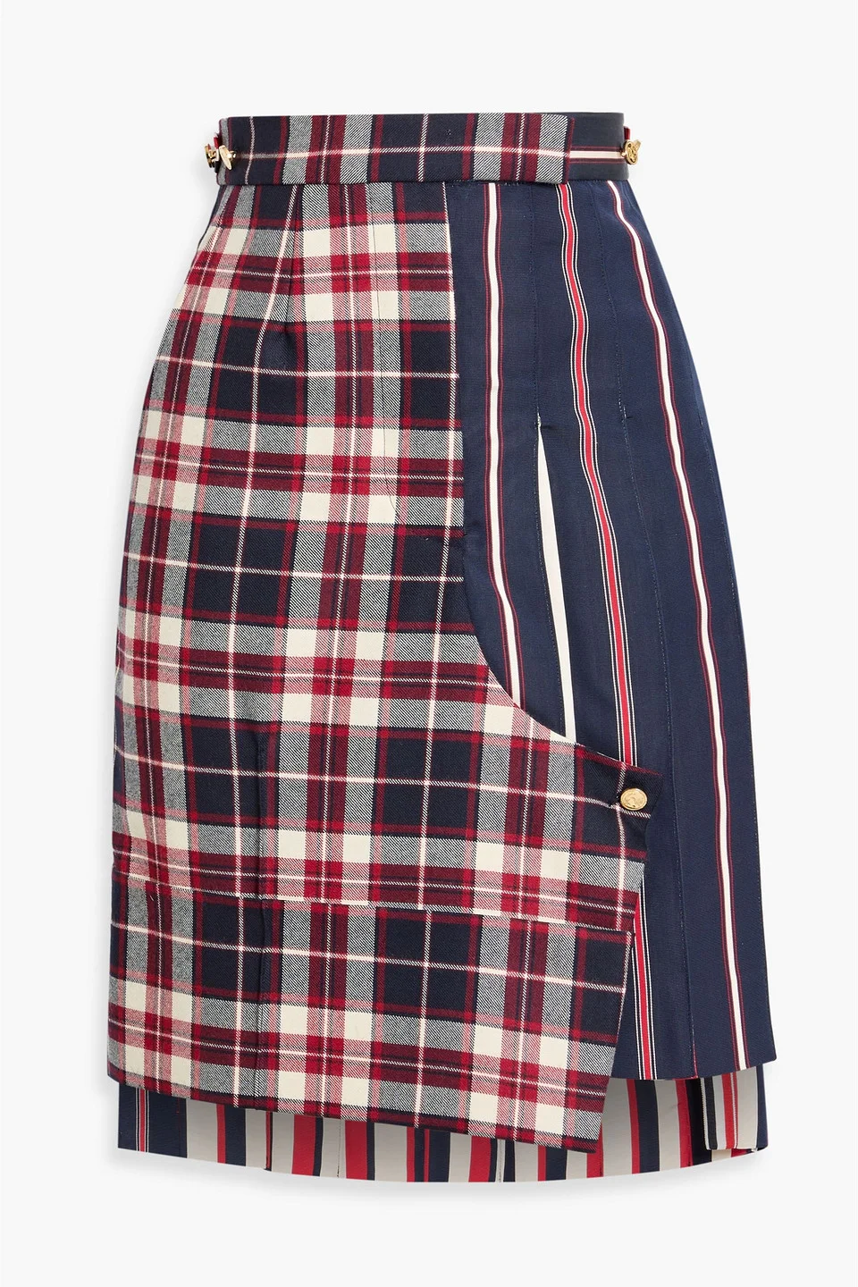 Skirt checked silk and cotton-blend pleated striped trims buttoned waist tabs front slant pocket asymmetric hem fully lined concealed hook and button fastenings along front mid-weight, non-stretchy fabric dry clean made in italy 56% Silk 44% Cotton Product Code 46376663163085857