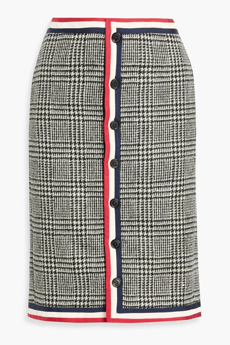 Skirt prince of wales checked wool-felt striped trims fully lined button fastenings through front mid-weight, non-stretchy fabric dry clean made in italy 100% Wool Product Code 46376663163084743