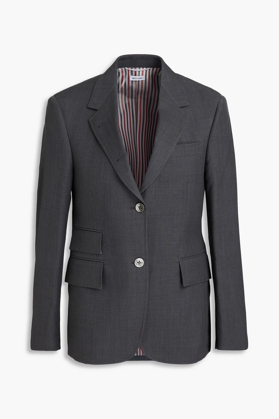 Blazer pique wool breast pocket three front flap pockets button fastenings through front fully lined back vent mid-weight, non-stretchy fabric dry clean made in japan 100% Wool Product Code 46376663162850901