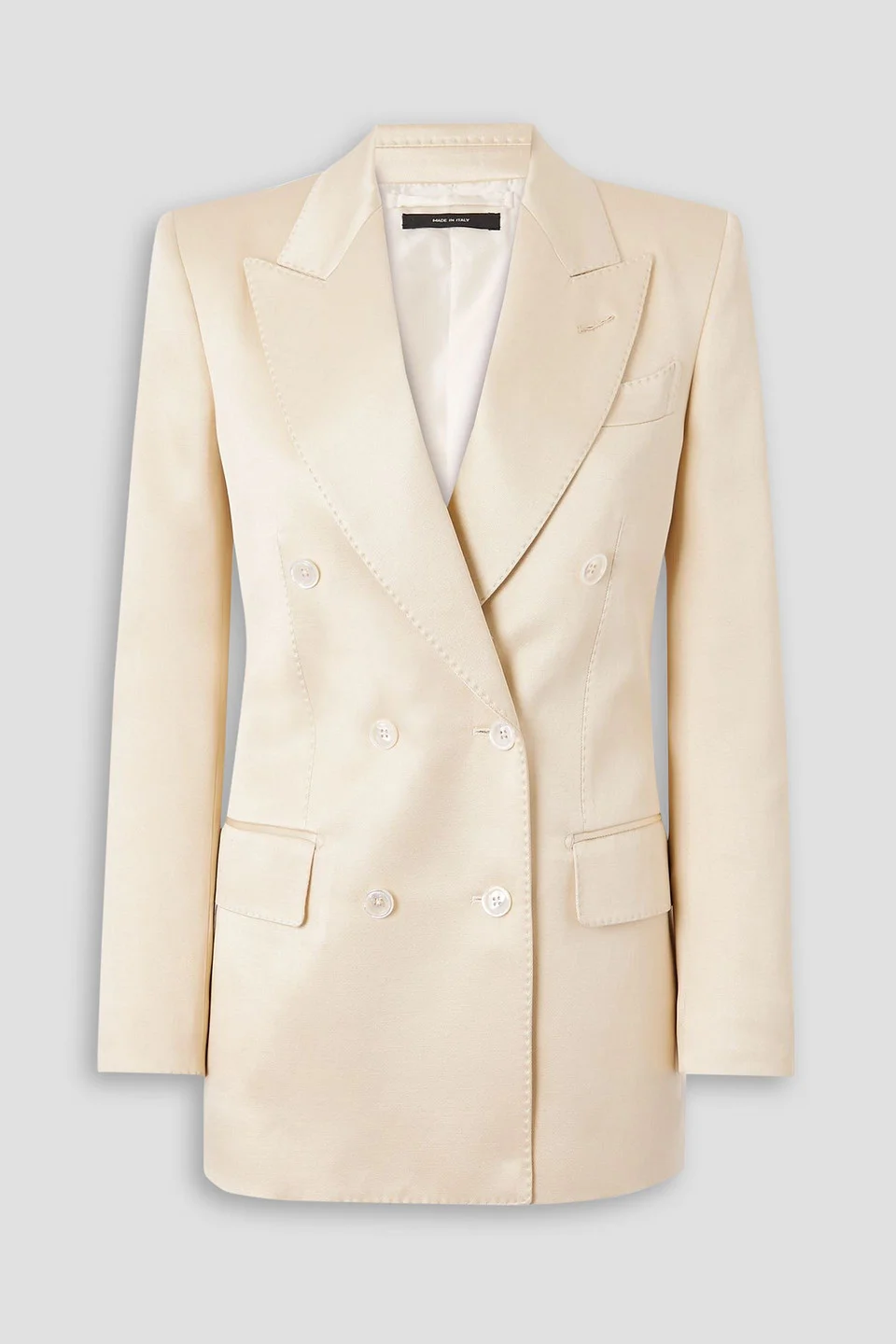 Blazer twill silk and wool-blend mother-of-pearl buttons shoulder pads buttoned cuffs breast pocket front flap pockets button fastenings through double-breasted front fully lined back vent mid-weight, non-stretchy fabric dry clean made in switzerland 59% Silk 41% Wool 0% Pinctada Maxima (farmed): Australia Product Code 46376663163024231
