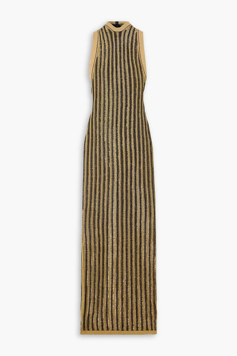 Dress metallic wool-blend concealed hook and zip fastening at back mid-weight knit dry clean made in italy Tom Ford's maxi dress is knitted with black and gold stripes that'll shimmer in the light. It's made from wool-blend and hugs your figure all the way to the hemline. Wear it with a pair of the brand's iconic pumps. 60% Virgin Wool 28% Viscose 12% Metallic fiber Product Code 46376663163074590
