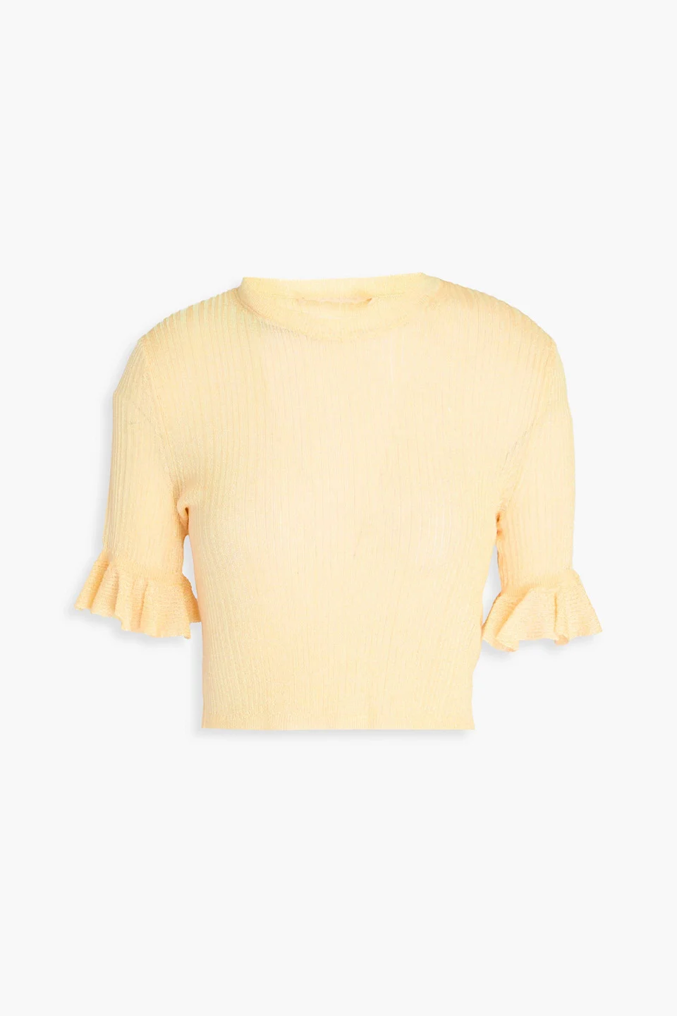 Top metallic ribbed-knit cropped ruffled cuffs slips on lightweight knit dry clean imported 69% Viscose 31% Polyester Product Code 1647597356714051