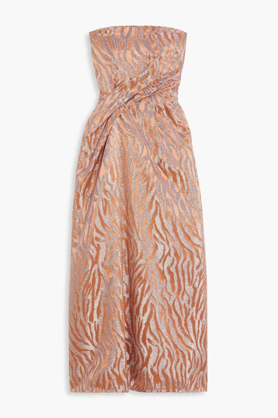 Raina strapless metallic satin-jacquard midi dress