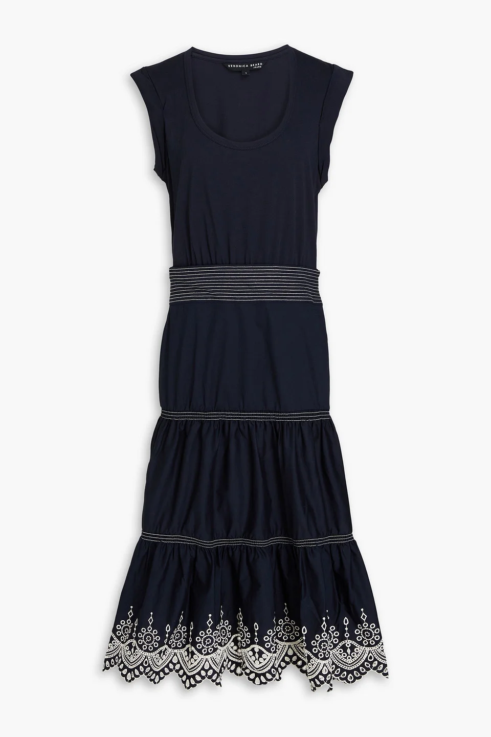 Dress cotton-jersey cotton-poplin paneled broderie anglaise trims tiered slips on mid-weight, slightly stretchy fabric machine wash or dry clean imported please visit the editor's notes for more information on designer size conversions The party won’t start until you walk in wearing the ‘Amaia’ midi dress from Veronica Beard. The beautiful tiered design is made from cotton that feels as good as it looks, with pretty broderie anglaise trims along the hem. Elevate your outfit with sandals and a clutch for a night to remember. 100% Cotton Product Code 1647597345414114