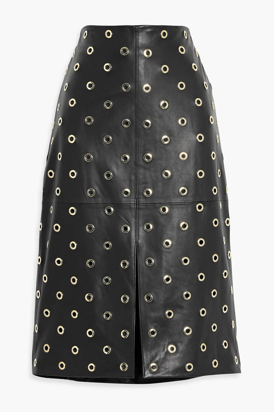 Skirt leather eyelets front slit fully lined concealed hook and zip fastening at side supple, non-stretchy leather dry clean imported 100% Lambskin Product Code 46376663163037374