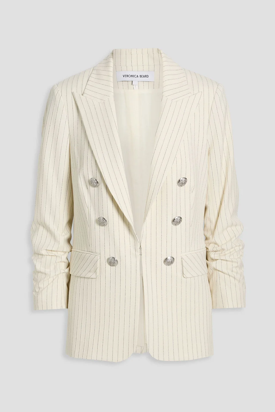 Blazer pinstriped jacquard button-embellished shoulder pads ruched sleeves buttoned cuffs front flap pockets concealed hook fastening at front fully lined back vent mid-weight, slightly stretchy fabric dry clean want to switch it up? pair it with one of the label’s oh-so-clever (and interchangeable) dickeys 67% Polyester 29% Viscose 4% Elastane Product Code 46376663162974759