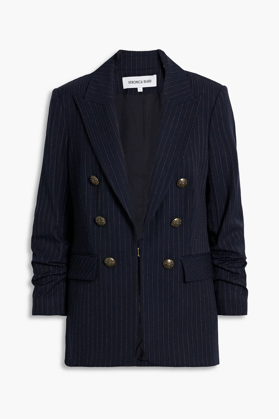 Blazer pinstriped jacquard button-embellished shoulder pads ruched sleeves buttoned cuffs front flap pockets concealed hook fastening at front fully lined back vent mid-weight, slightly stretchy fabric dry clean want to switch it up? pair it with one of the label’s oh-so-clever (and interchangeable) dickeys 67% Polyester 29% Viscose 4% Elastane Product Code 46376663162972963