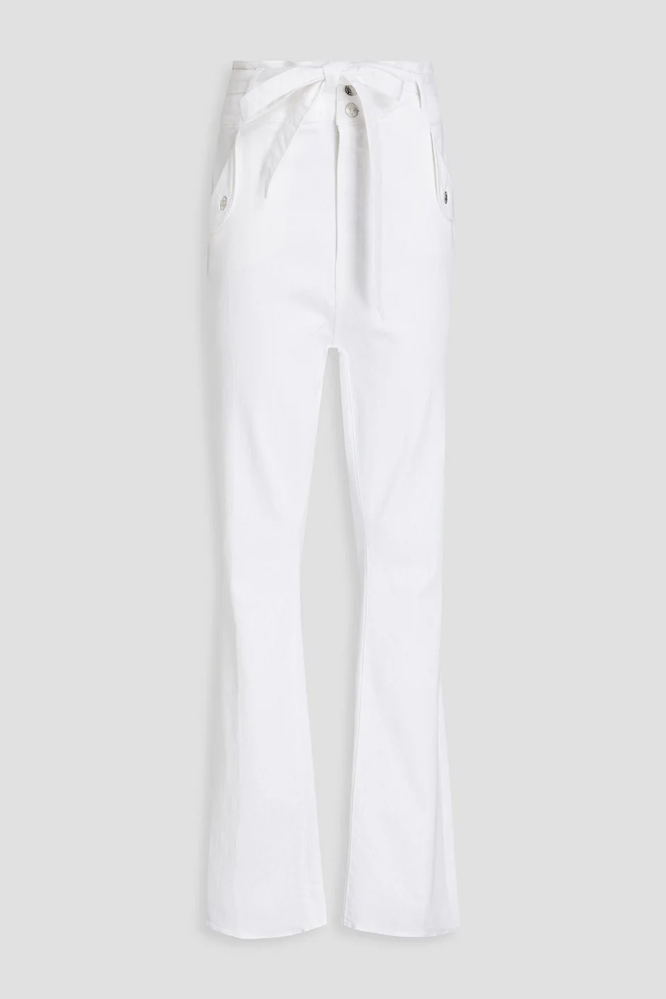 Bootcut jeans denim detachable waist tie belt loops high-rise cut multipockets button and concealed zip fastenings at front mid-weight, non-stretchy fabric hand wash or dry clean imported Step into sophistication with Veronica Beard's high-rise bootcut jeans. They have a sleek silhouette complemented by a detachable waist tie for added flair, making them ideal for busy days around the city. Wear them with a tailored blazer or a blouse and sandals. 91% Cotton 7% Polyester 2% Polyurethane Product Code 1647597289883995
