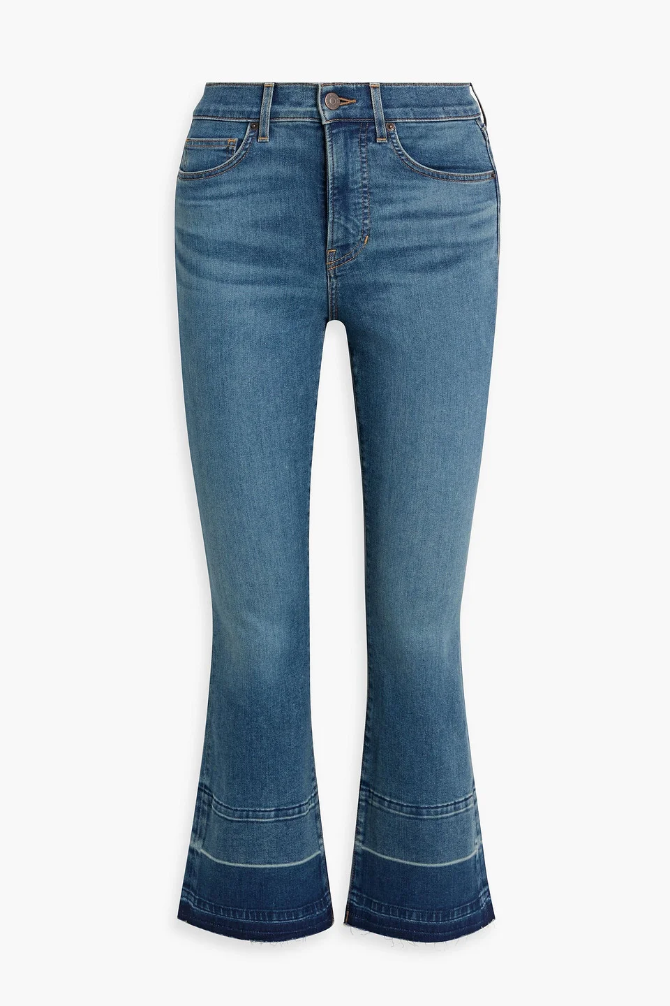 Kick-flare jeans faded denim belt loops high-rise cut five pockets button and concealed zip fastening at front frayed cuffs mid-weight, slightly stretchy fabric machine wash 92% Cotton 6% Elastomultiester 2% Polyurethane Product Code 46376663163039061