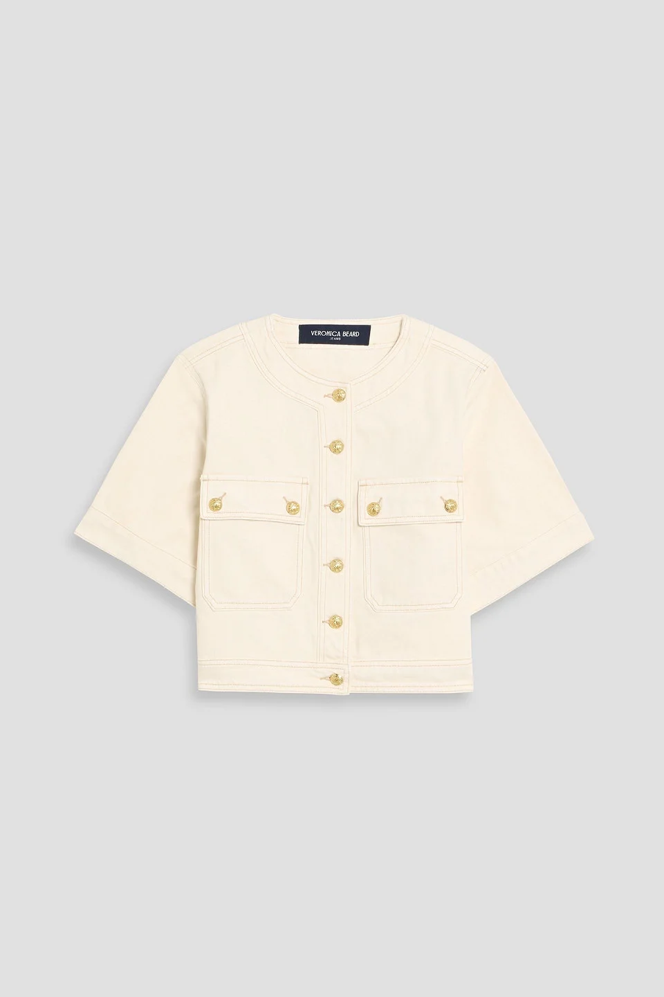 Jacket denim cropped buttoned cuffs breast pockets button fastenings through front mid-weight, non-stretchy fabric dry clean imported 100% Cotton Product Code 46376663163065444