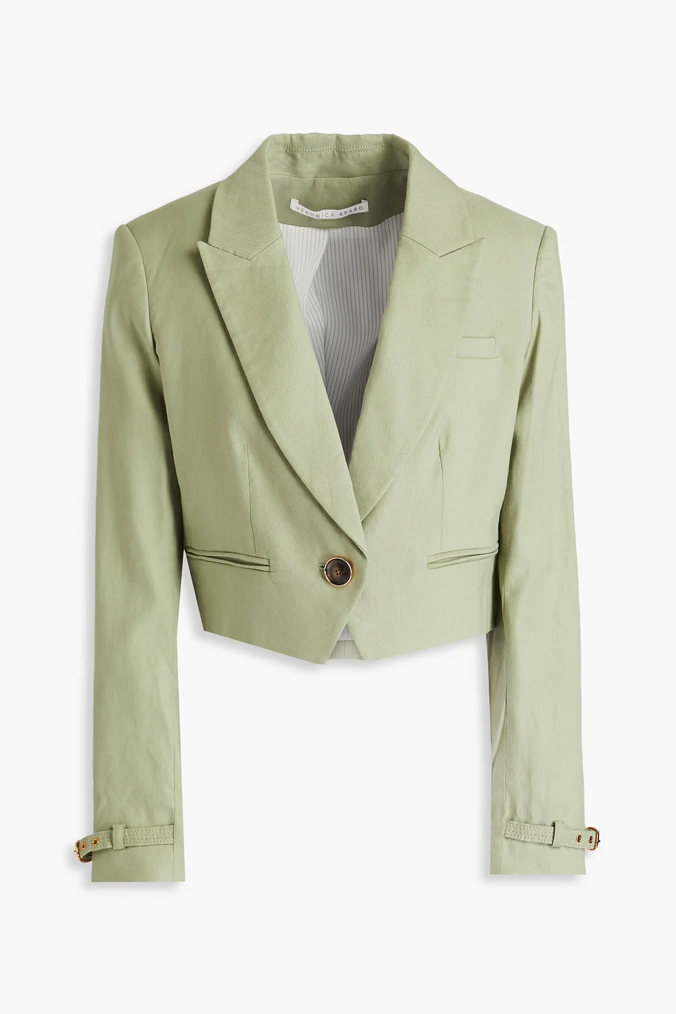 Blazer linen-blend cropped shoulder pads buckled cuffs breast pocket two front welt pockets button fastening at front fully lined mid-weight, non-stretchy fabric dry clean imported Embrace elegance with Veronica Beard's ‘Girard’ blazer. This cropped style, made from sage green linen-blend, showcases a single-breasted cut and buckled cuffs that redefine classic tailoring. Perfect for sophisticated evenings, it’s the ultimate statement piece for your wardrobe. 56% Linen 41% Tencel® 3% Elastane Product Code 1647597345359952