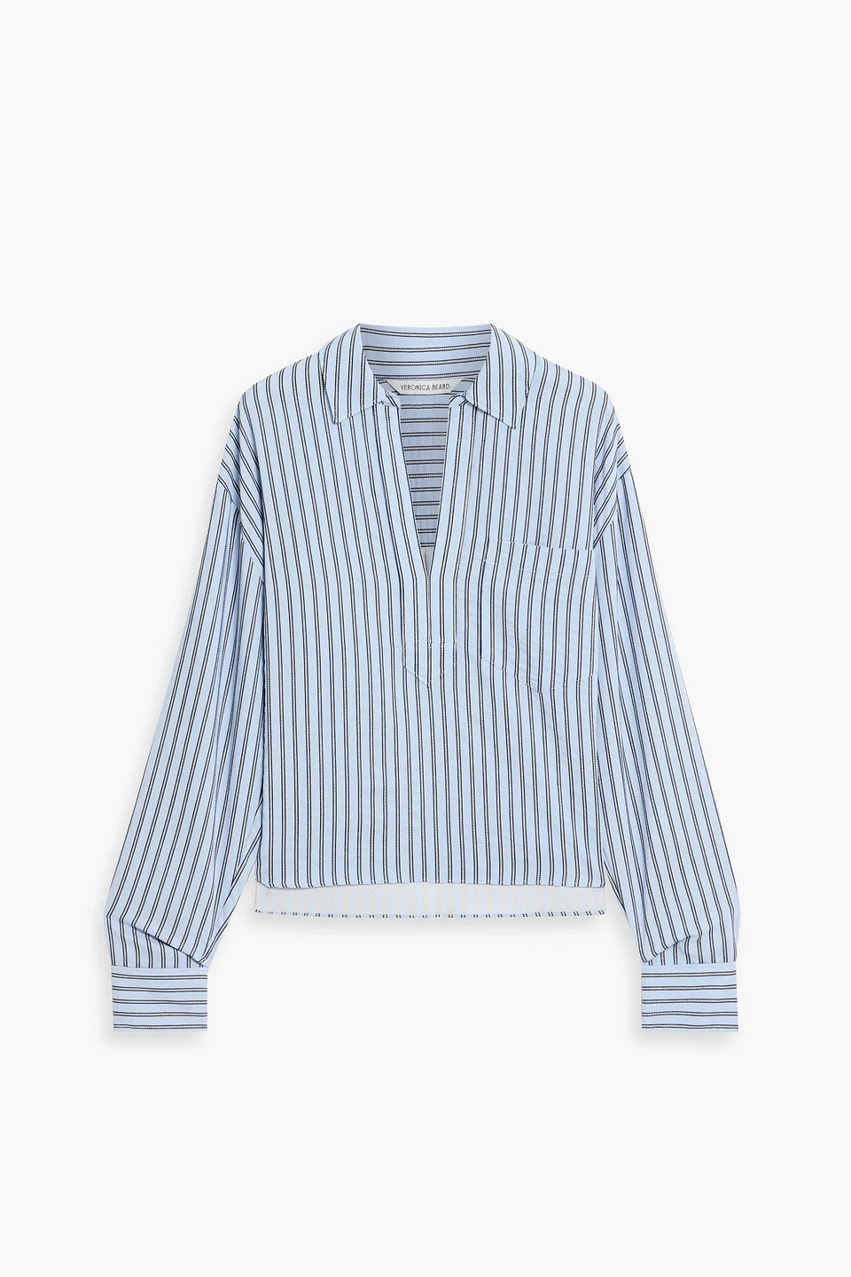 Top striped oxford embroidered pleated back buttoned cuffs breast pocket slips on mid-weight, non-stretchy fabric dry clean imported 53% Polyester 47% Viscose Product Code 46376663163065558