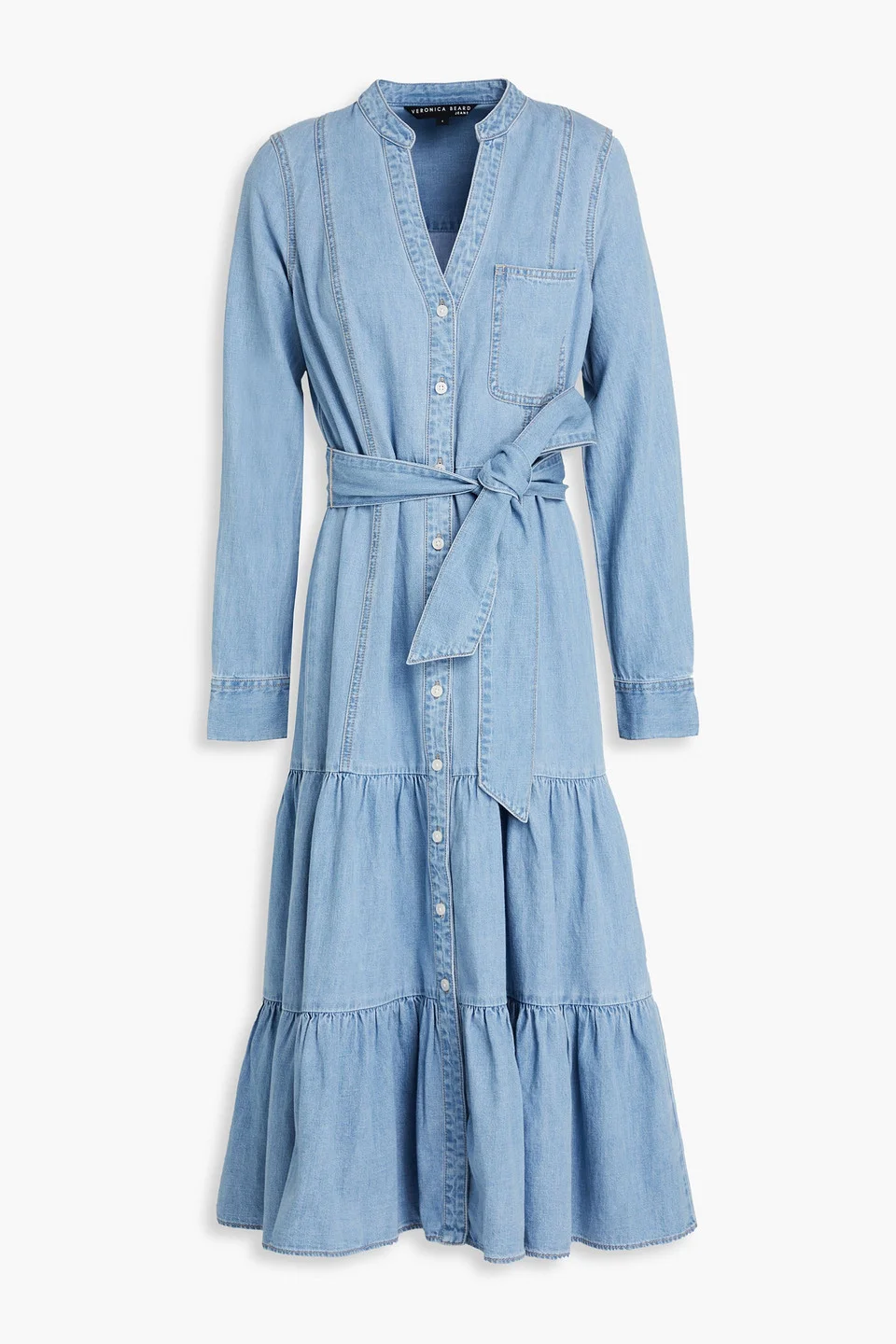 Dress denim tiered detachable waist tie breast pocket button fastenings through front mid-weight, non-stretchy fabric machine wash or dry clean imported 100% Cotton Product Code 1647597345337306