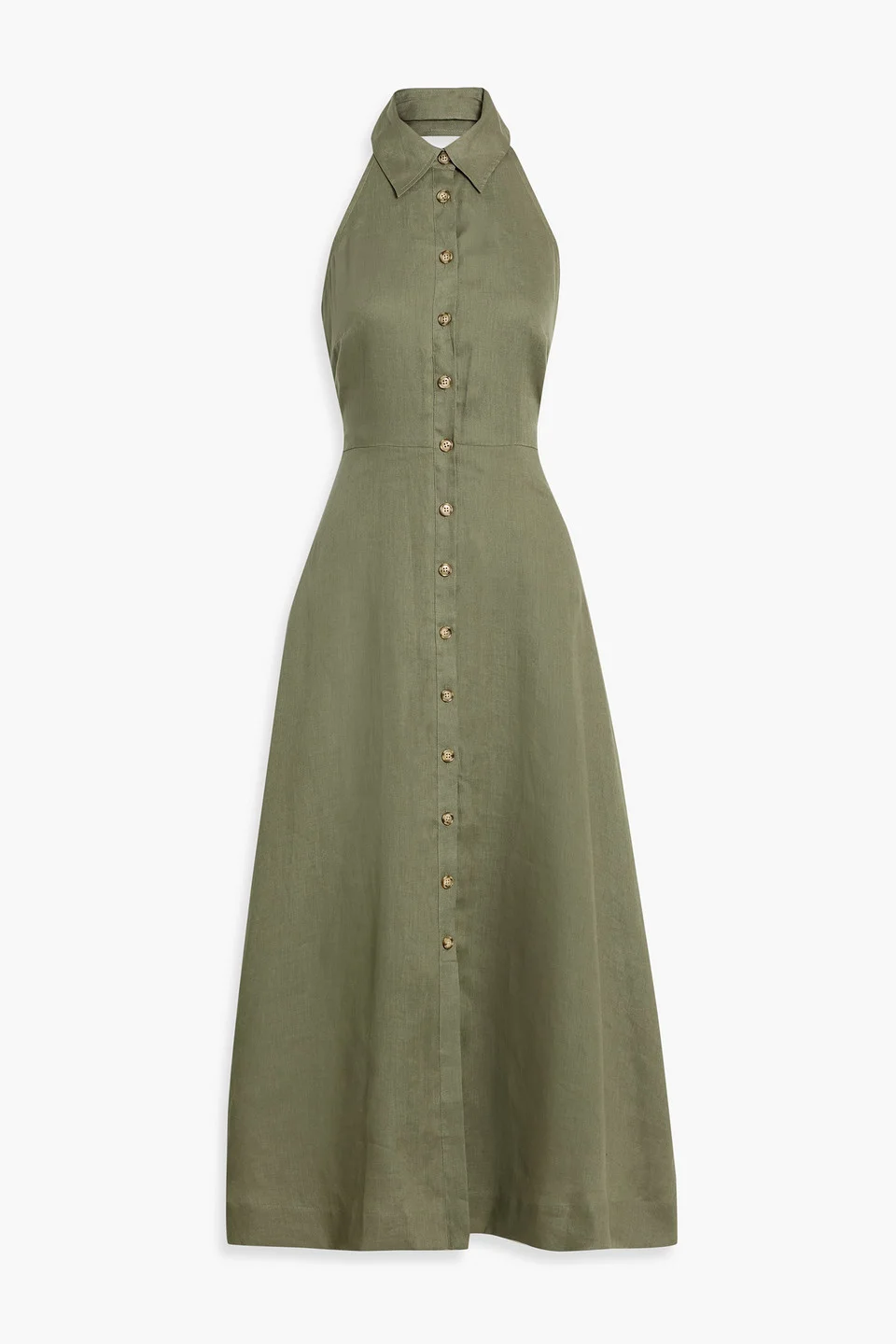 Dress linen ruched button fastenings through front fully lined mid-weight, non-stretchy fabric dry clean imported 100% Linen Product Code 46376663163065575