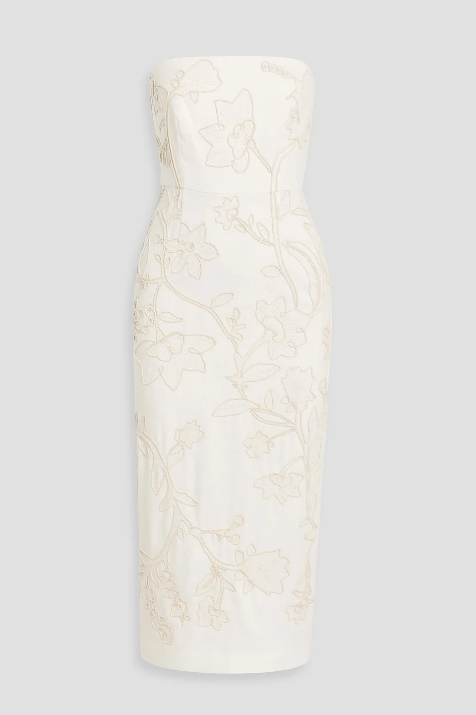 Strapless dress linen-blend twill embroidered back slit concealed hook and zip fastening at back internal bustier fully lined mid-weight, slightly stretchy fabric dry clean imported 53% Linen 29% Polyester 16% Viscose 2% Elastane Product Code 46376663163065115