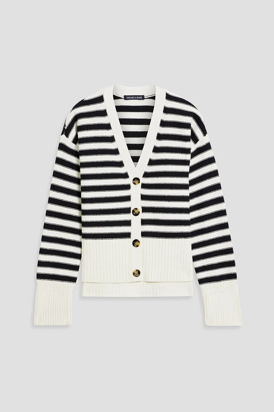 Cardigan striped cotton ribbed trims side slits button fastenings through front dipped back hem mid-weight knit dry clean imported 100% Cotton Product Code 46376663162911800