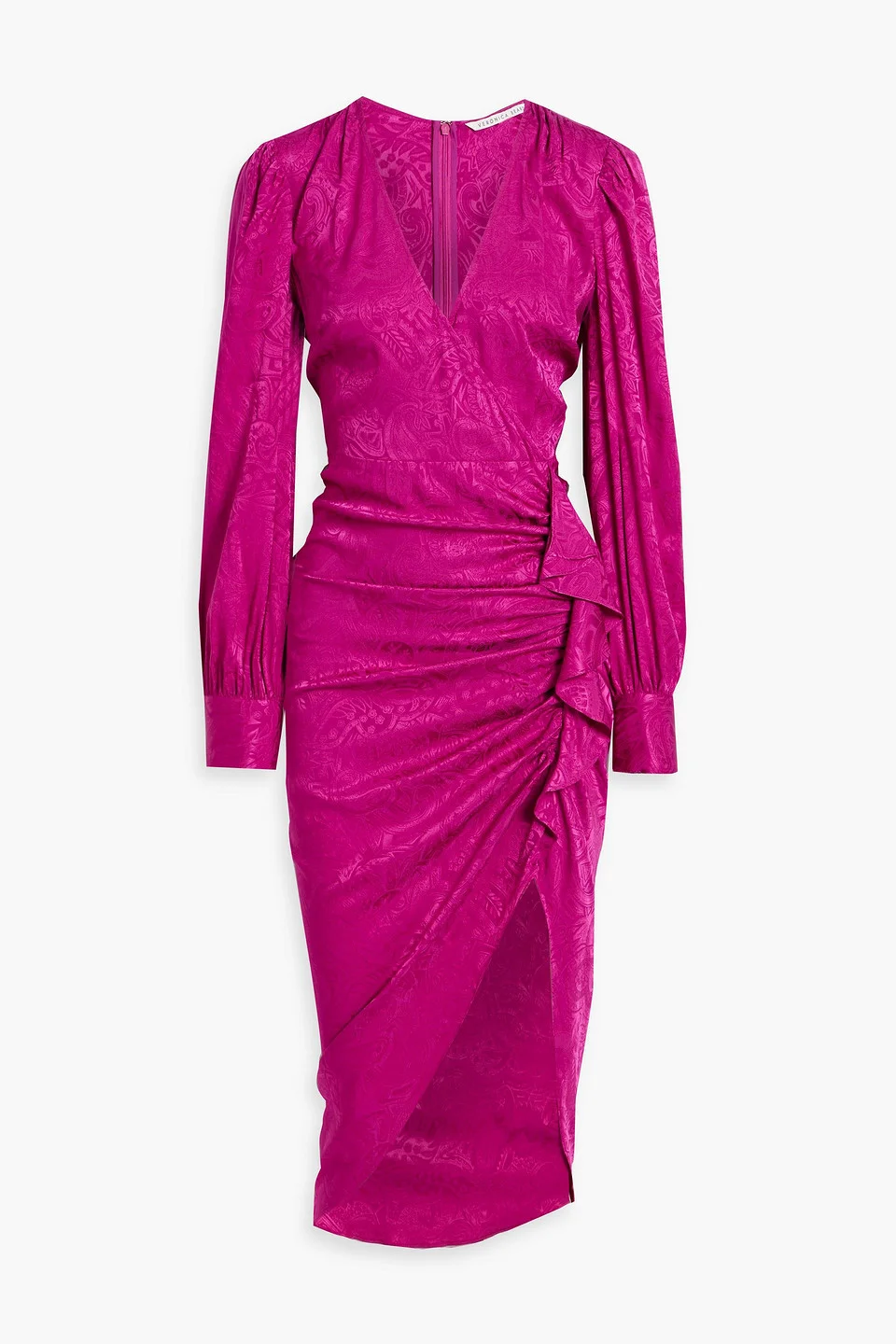Dress jacquard silk-blend wrap-effect ruffled buttoned cuffs concealed hook and zip fastening at back mid-weight, slightly stretchy fabric dry clean imported 52% Silk 40% Viscose 8% Spandex Product Code 1647597345593065