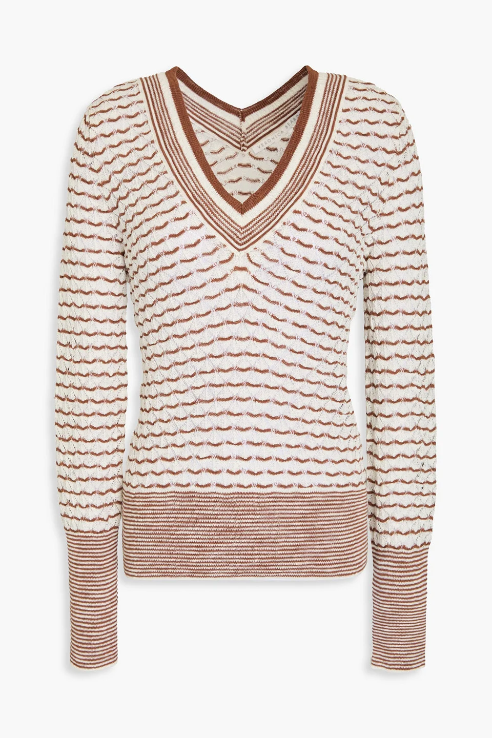 Sweater crochet-knit cotton-blend striped trims ribbed trims slips on lightweight knit dry clean imported What’s not to love about the ‘Zinya’ sweater by Veronica Beard? Its crochet-knitted cotton and striped design create a playful yet polished vibe that’s perfect for any occasion. Slip it on with tailored trousers or a flowing skirt, and you’re ready to shine. 93% Cotton 7% Polyamide Product Code 1647597357583814