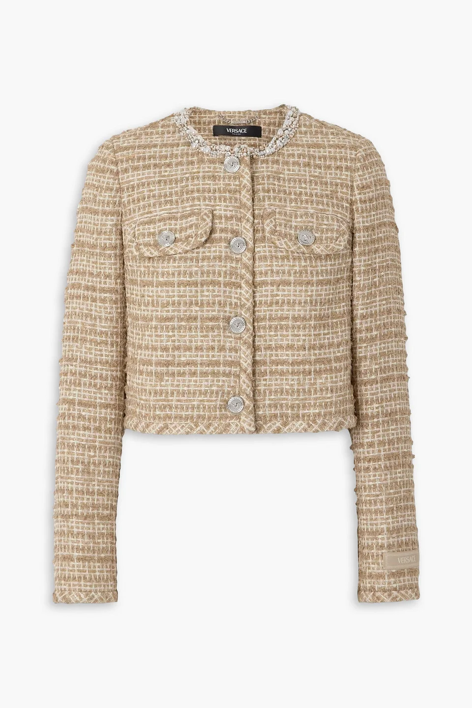Jacket cotton-blend tweed crystals beads shoulder pads buttoned cuffs breast pockets button fastenings through front mid-weight, non-stretchy fabric dry clean made in italy 75% Cotton 17% Polyamide 8% Polyester Product Code 46376663163079443